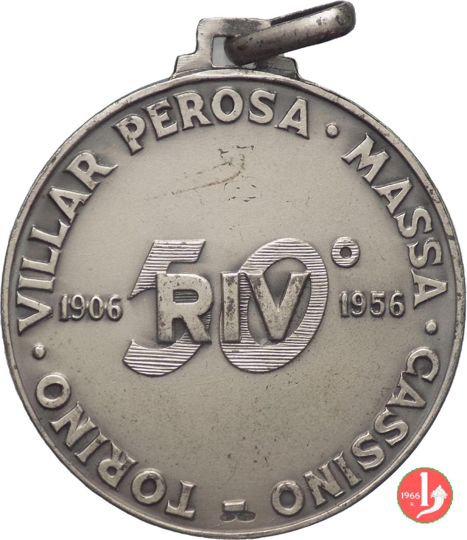50° Fiat 1956 Dritto: GIOVANNI E EDOARDO AGNELLI busto accollati a sx di Edoardo Agnelli con cravatta e di Giovanni Agnelli con papillon nel campo a dx corsivo: E. RUBINO nel campo: RIV SU 50° tra 1906 e 1956 | |