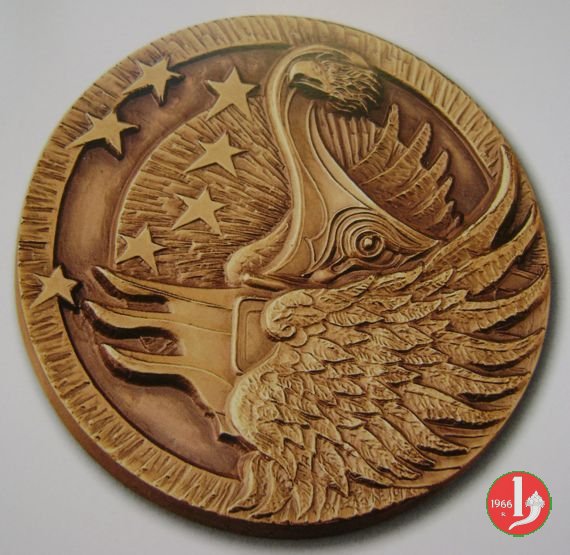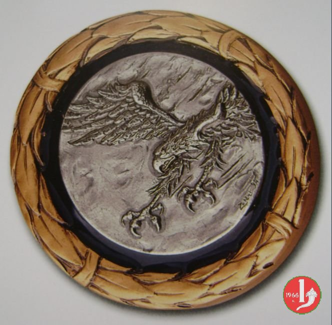 50° Anniversario Scuola Aerocooperazione di Guidonia Dritto: Rappresentazione di un bassorilievo in bronzo, realizzato negli anni "70 dallo scultore L. Colombini, costituente la parte focale del monumento "AGLI OSSERVATORORI CADUTI"; il bassorilievo rappresenta un pilota ed un osservatoe affiancati, che scrutano attenti il cielo, stanti in una originale postura che dà la realistica sensazione del volo; il bassorilievo è contornato da smalto blu simboleggiante il cielo, su cui è rappresenatat la Costellazione del carro, all'esergo il motto del reparto "UNA LA META. UNA LA SORTE" sovrastato dal distintivo di merito degli osservatori dall'aeroplano; intorno una cornice raggiata; a destra i nomi dell'autore del bassoriòievo L. COLOMBINI e di quello della medaglia Zanelli. Verso: Nel giro la scritta CINQUANTENNALE SCUOLA DI AEROCOOPERAZIONE tra due stellette ed un'aquila da pilota militare, nel giro, su piano inclinato; su disco centrale rialzato, in alto l'araldica della Scuola di Aerocooperazione affiancata dalle date 1951 - 2001, all'esergo, GUIDONIA, tra due stellette militari. | |