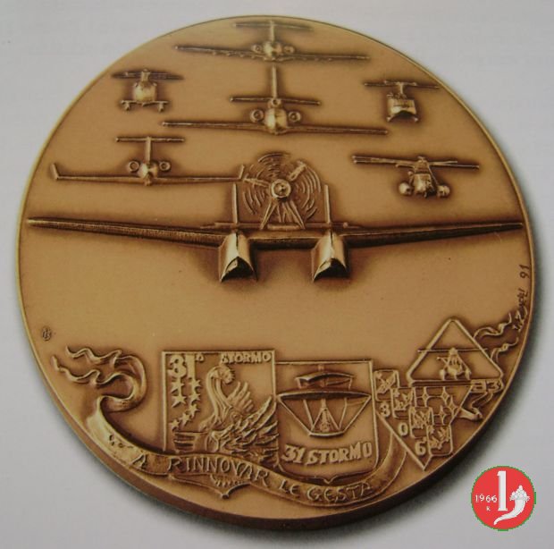 31° Stormo di Ciampino Dritto: Raffigurata l'araldica del 31° Stormo derivata dal distintivo della 1^ Squadriglia Navale Siluranti Aeree, ideato, all'atto della sua costituzione, durante la Prima Guerra Mondiale, dal Comandante Gabriele D'Annunzio; questo distintivo, che si ispira alla simbologia delle antiche monete romane, raffigura una prua di nave, armata di rostro con ali e testa d'aquila, su fondo raggiato e punteggiato di stelle; a destra la firma dell'incisore e la data 91. Verso: Al centro della medaglia si staglia, con un marcato rilievo, un S.M. 55 X, velivolo con il quale nel 1938 fu costituito il 31° Stormo; sopra gli aeromobili attualmente in forza allo Stormo ed in esergo, gli stemmi araldici adottati, nel corso dei suoi cinquanta anni di storia, dal 31° Stormo e quelli delle sue due attuali squadriglie la 93^ e la 306^, fra cui, uno svolazzante cartiglio con il motto A RINNOVAR LE GESTA. | |