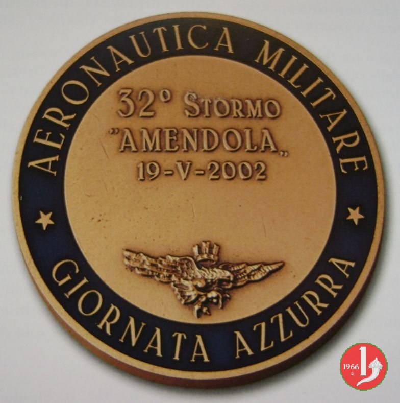 Gironata Azzurra - Amendola 19/V/2002 Dritto: Una cornice esterna di bronzo, formata da frode di alloro, fa da costone ad una medaglia in bronzo argentato, raffiguarante l'araldica del 32° Stormo, un falco in picchiata, circondata da una fascia di smalto blu; a destra lungo il bordo la firma dell'artista e la data 94. Verso: Nel giro la scritta AERONAUTICA MILITARE GIORNATA AZZURRA tra due stellette e in una cornice di smalto blu; nel campo 32° STORMO = AMENDOLA = 19 V 2002 su tre righe; in esergo un'aquila da pilota militare. | |