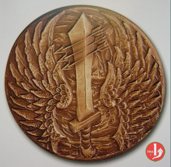 Comando Squadra Aerea Dritto: Raffigurato lo stemma araldico del Comando Squadra Aerea, bastone di comando entro cornice rettangolare con motivo a greca, immerso in smalto blu; fondo a raggiere; lo stemma è una rielaborazione di una spallina da divisa ordinaria, da Generale della Regia Eronautica; lungo il bordo a sinistra la firma dell'artista. Verso: Nel giro la scritta COMANDO SQUADRA AEREA e tre stellette, nel giro su piano inclinato; su tondo centrale, in alto, un'aquila da pilota militare e all'esergo un cartiglio con il motto della Squadra Aerea VIRTVTE IMPERA; il campo della medaglia è liscio per l'incisione di eventuali dediche. | |