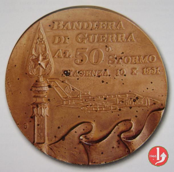 Riconsegna della Bandiera di Guerra al 50° Stormo Dritto: Raffigurato un gladio e tre frecce circondati da un volo d'ali che occupano interamente il campo della medaglia e costituiscono l'araldica del 50° Stormo che deriva dal vecchio distintivo di specialità "Assalto e Combattimento"; gli elementi araldici si stagliano su un fondo turbinoso, che rievoca gli eventi bellici, nei quali è stato impegnato lo Stormo, dalla sua costituzione nel 1936 alle imprese della Seconda Guerra Mondiale per finire con le operazioni svolte dell'ONU per la liberazione del Kuwait; a destra lungo il bordo la firma dell'artista. Verso: Nel campo della medaglia la scritta BANDIERA = DI GUERRA = AL 50° STORMO = PIACENZA 10 X 1991 su quattro righe; alla silhouette grafica di un Tornado con i contrassegni dello Stormo fa da contrappunto il modellato in altorilievo del puntale dell'asta della Bandiera di Guerra, di cui è visibile una parte del drappo; a sinistra lungo il bordo, la firma dell'artista e la data 91. | |