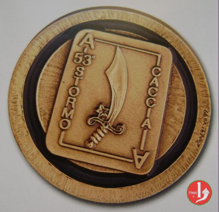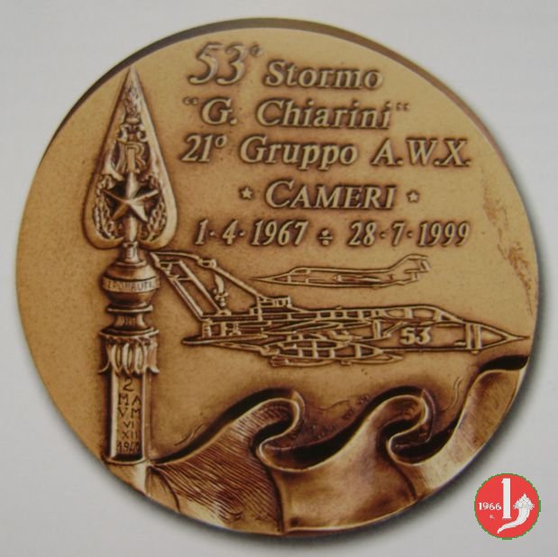 Scioglimento 53° Stormo Dritto: Al centro della medaglia campeggia l'araldica del 53° Stormo, la carta da gioco Asso di Spede su cui è la legenda 53° STORMO / CACCIA posta su fondo raggiato, intorno una fascia di smalto blu; a destra lungo il bordo la firma dell'artista e la data VII 99. Verso: Nel campo e su cinque righe la scritta 53° STORMO = "G.CHIARINI" = 21 GRUPPO A.W.X. = CAMERI = 1.4.1967 - 28.7.1999; in primo piano, il puntale dell'asta della bandiera di Guerra dello Stormo, su cui è scritta incisa "2 M.A.V.M." indica il numero delle medaglie d'argento al Valor Militare conferite allo Stormo in operazioni belliche durante la Seconda Gueraa Mondiale, al centro della medaglia, la silhouette grafica di un Tornado con i contrassegni dello Stormo, incrociato da un F104, in secondo piano, velivolo in dotazione per oltre trenta anni presso il 53° Stormo; tra le pieghe del drappo della bandiera, la firma dell'artista e la data VII 99. | |