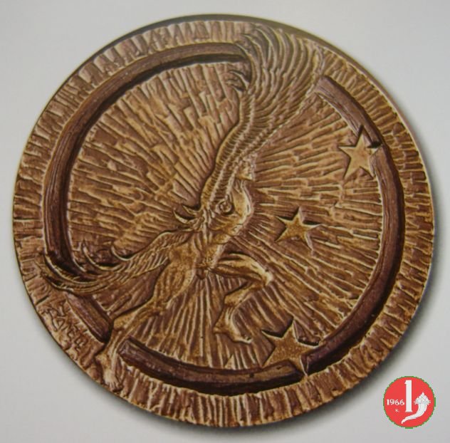 Medaglia di lunga navigazione aerea Dritto: Affiancata da cinque teste di aquila, la testa alata d'Italia, con corona turrita, sulla quale è una stella a cinque punte; sotto, la parte superiore del globo terracque, emergente da un banco di nubi; a destra la firma dell' autore P.MORBIDUCCI Verso: Nei tre quinti superiori del campo, un'aquila ad ali spiegate, con la testa rivolta a destra verso una stella a cinque punte, raggiante, e che stringe fra gli artigli un ramo di quercia; sotto: "REPUBBLICA ITALIANA"; in esergo, nel giro la sigla Z indicante la coniazione ad opera della zecca di Roma. | |