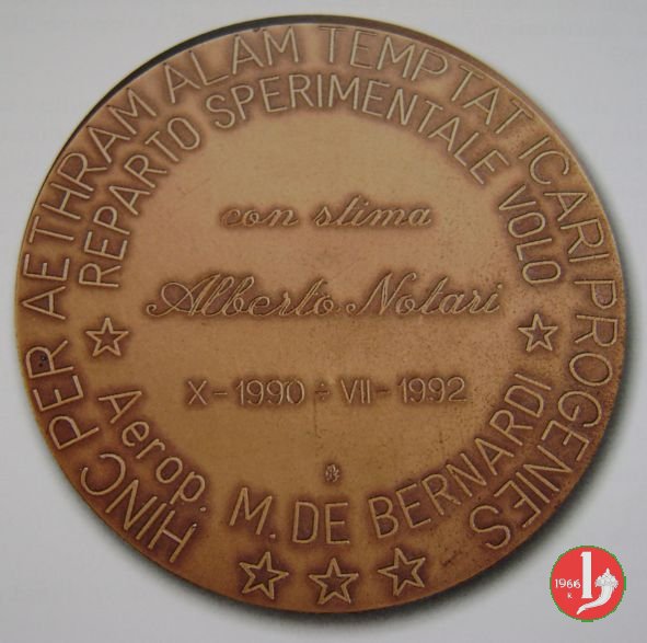 Medaglia del Comando R.S.V. Dritto: Raffigurata la mitica figura di Icaro colta nell'attimo in cui sta per spiccare il volo, araldica del reparto Sperimentale di Volo; davanti tre stelle che rappresentano i tre records mondiali conquistati dal R.S.V. Verso: Nel giro su due righe la scritta HINC PER AETHRAM ALAM TEMPTAT ICARI PROGENIES = REPARTO SPERIMENTALE VOLO AEROP. M. DE BERNARDI; in esergo tre stellete; nel campo della medagli su tre righe la scritta CON STIMA = ALBERTO NOTARI = X-1990 - VII-1992. | |