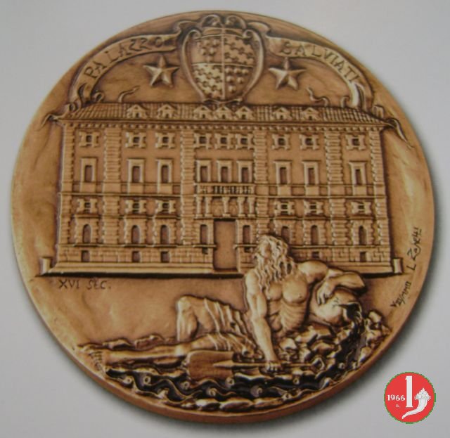 Medaglia del Centro Alti Studi per la Difesa Dritto: Raffigurata la facciata di Palazzo Salviati a Roma, attuale sede del Centro Alti Studi per la Difesa, sovrastata dallo stemma del Cardinale Salviati tra due stellette militari e da un cartiglio iscritto PALAZZO SALVIATI; alla base della facciata, a sinistra XVI SEC. epoca della costruzione del palazzo, che sorge sulle sponde del fiume Tevere, personificato dalla figura sdraiata con il braccio poggiato su una brocca, da cui sgorga acqua, resa con intarsi di smalto blu trasparente; a destra lungo il bordo la firma dell'artista e la data V II / MMII. Verso: Nel giro la scritta CENTRO ALTI STUDI PER LA DIFESA; su disco centrale rialzato, in alto, lo stemma del C.A.S.D.; all'esergo su cartiglio il motto VT VNVM SINT; al centro uno spazio vuoto per eventuali dediche; in basso a destra la firma dell'artista. | |