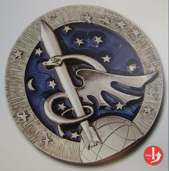 50° Anniversario della costituzione dell'A.I.M.A.S. Dritto: Raffigurato il logo dell'A.I.M.A.S.( Associazione di Medicina Aeronautica e Spaziale), un missile avvolto dalle spire di un serpente alato, mitologica allegoria aeronautica del caduceo di Esculapio, si staglia su un fondo di smalto blu, su cui sono rappresentati la costellazione del carro e altre stelle e pianeti a simboleggiare lo spazio; all'esergo, il globo terrestre; il bordo della medaglia è a fondo raggiato con effetto solare; a destra la firma dell'artista e la data 2002. Verso: Nel giro la scritta ASSOCIAZIONE ITALIANA DI MEDICINA AERONAUTICA E SPAZIALE; su disco centrale rialzato, in alto, su due righe la scritta CINQUANTENARIO = A.I.M.A.S., all'esergo le date 1952 - 2002; il campo è liscio per eventuali iscrizioni e dediche. | |