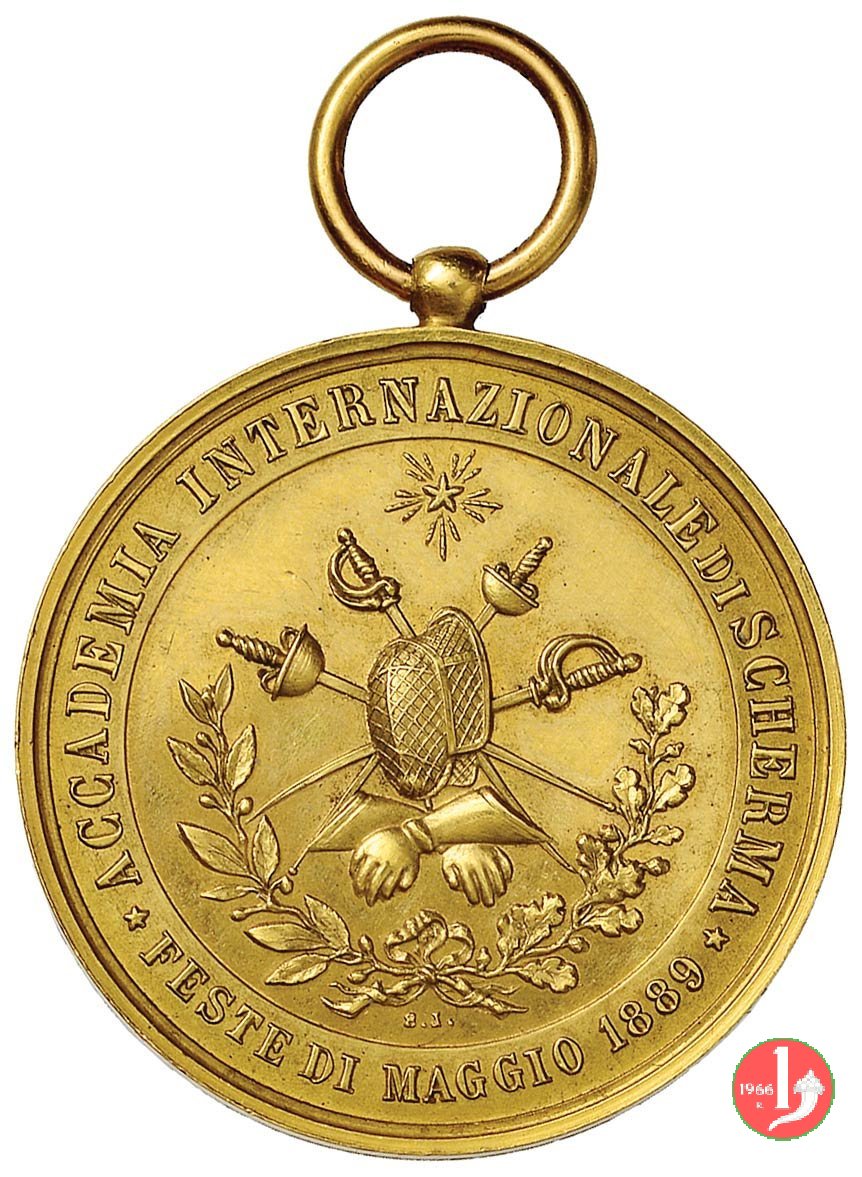 Accademia Internazionale di Scherma 1889 Dritto: ACCADEMIA INTERNAZIONALE DI SCHERMA = * FESTE DI MAGGIO 1889 * maschera su armi decussate sopra a guanti e tra rami d'alloro e quercia in basso: S.J. spazio per dedica in basso: Stemma coronato di Milano tra rami d'alloro e quercia | |
