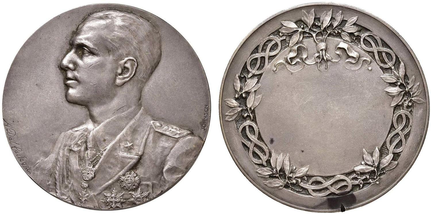Dritto: busto a sx con camicia, cravatta e divisa militare con le seguenti decorazioni: Collare e placca della SS. Annunziata , Collare e placca dell'Ordine dei SS. Maurizio e Lazzaro, placca di Gran Croce dell'Ordine della Corona d'Italia