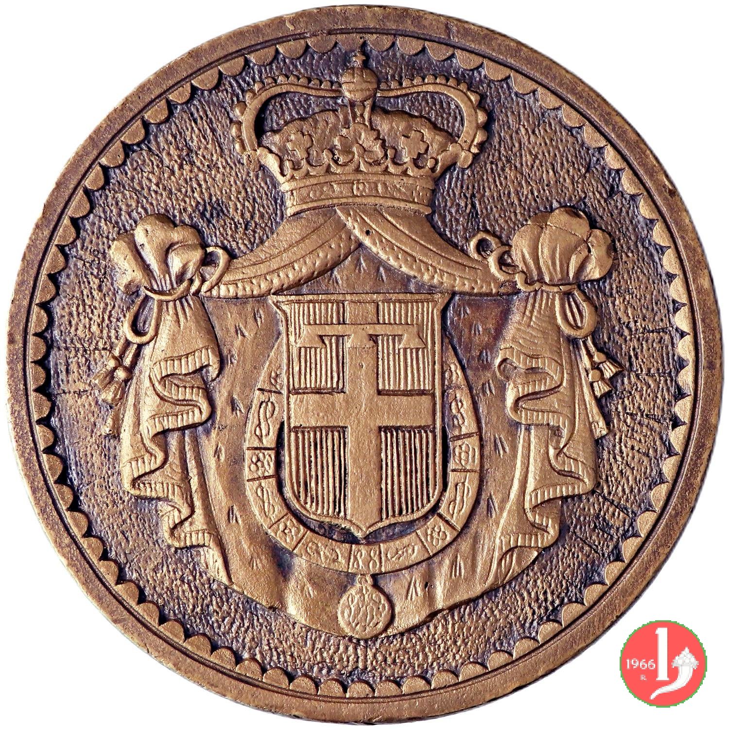 Dritto: Stemma Savoia coronato entro panneggio legato con fiocchi ai lati e contenuto nel collare della SS. Annunziata