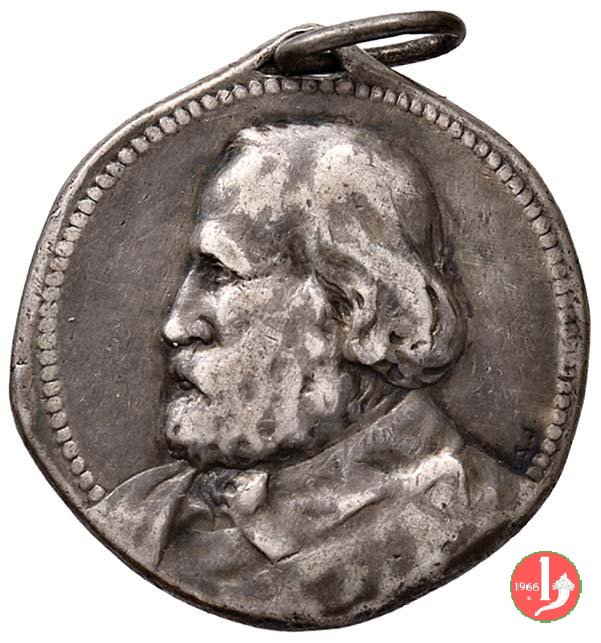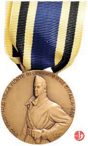 Verso: Figura angelica femminile, velata, in piedi, volta a dx, regge ramo di palma e serto d'alloro; sullo sfondo il rilievo dell'Italia vista dalle alpi