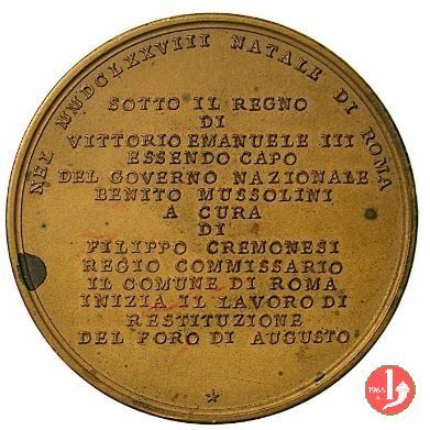 Foro di Augusto -C57 Obverse: vista panoramica del foro di Augusto sopra la linea dell'esergo ai lati: Z coronata _ P.T. in esergo: S.P.Q.R. nel campo: SOTTO IL REGNO = DI = VITTORIO EMANUELE III = ESSENDO CAPO = DEL GOVERNO NAZIONALE = BENITO MUSSOLINI = A CURA = DI = FILIPPO CREMONESI = REGIO COMMISSARIO = IL COMUNE DI ROMA = INIZIA IL LAVORO DI = RESTITUZIONE = DEL FORO DI AUGUSTO | |