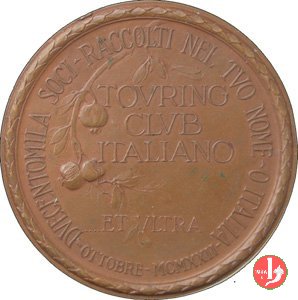 Touring Club Italiano 1922 Obverse: teste accollate a dx di due giovani: uno regge bandiera del TCI e l'altro elmato nel campo, a dx: VI - ET = MENTE a sx, presso il bordo: E. PAGANI in basso, monogramma: FSA nel campo: TOVRING = CLVB = ITALIANO in basso:...ET VLTRA in basso: - OTTOBRE - MCMXXII - | |