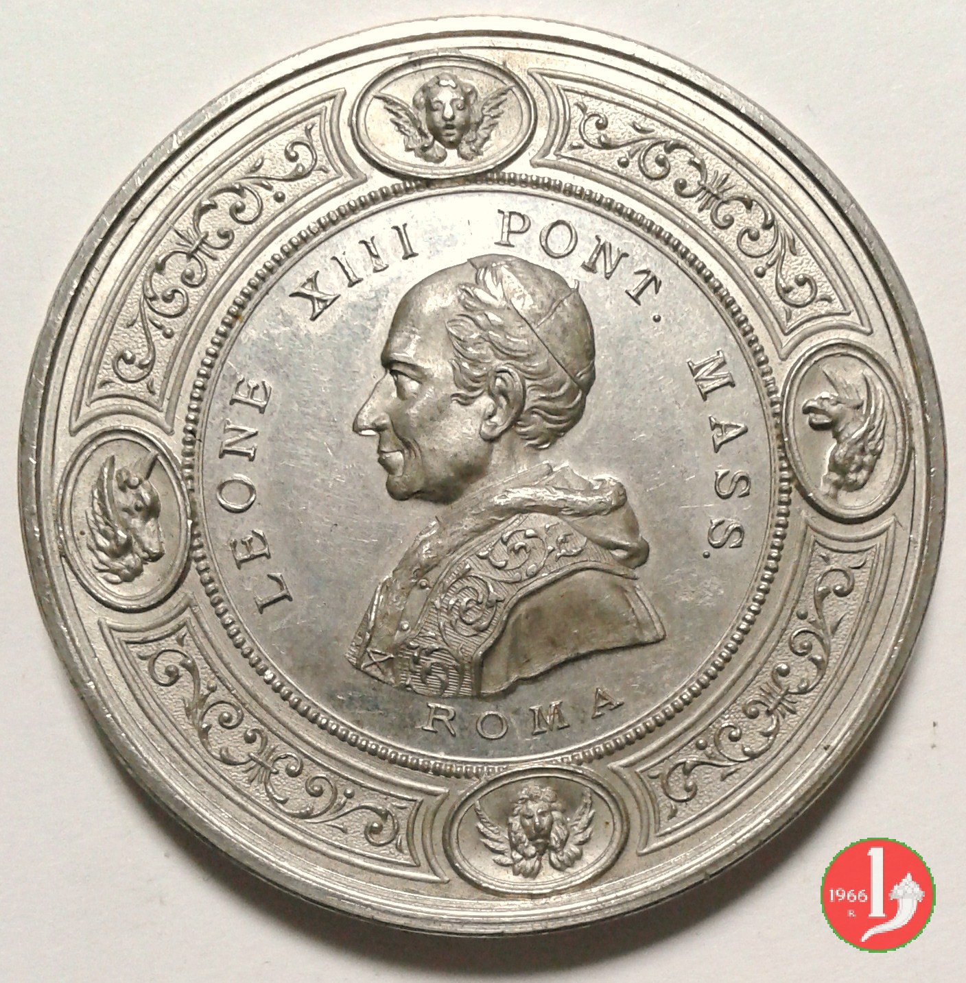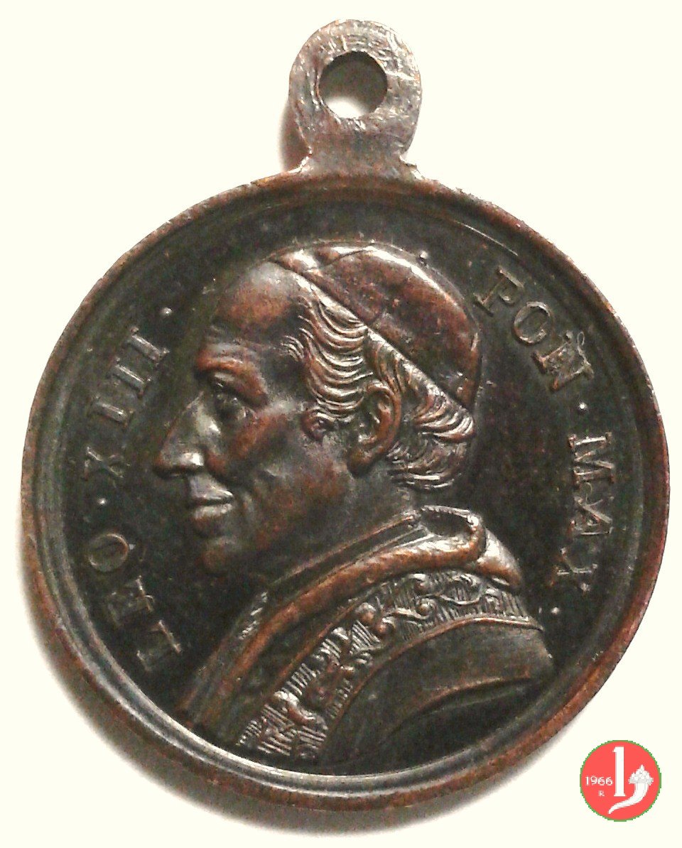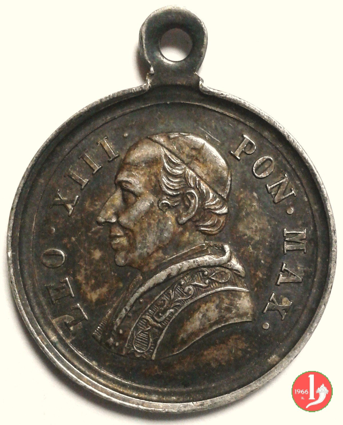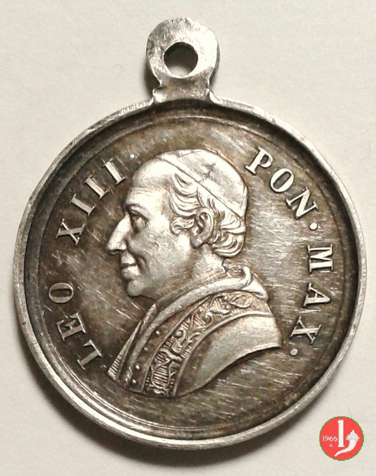 L'immacolata 20mm (1878) DRITTO: bust left in beaded circle, LEONE XIII PONTIFICE MASSIMO; in exergue ROMA ROVESCIO: Nimbate Virgin Mary with radiant hands (Miraculous Medal) within beaded circle;