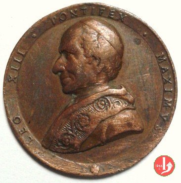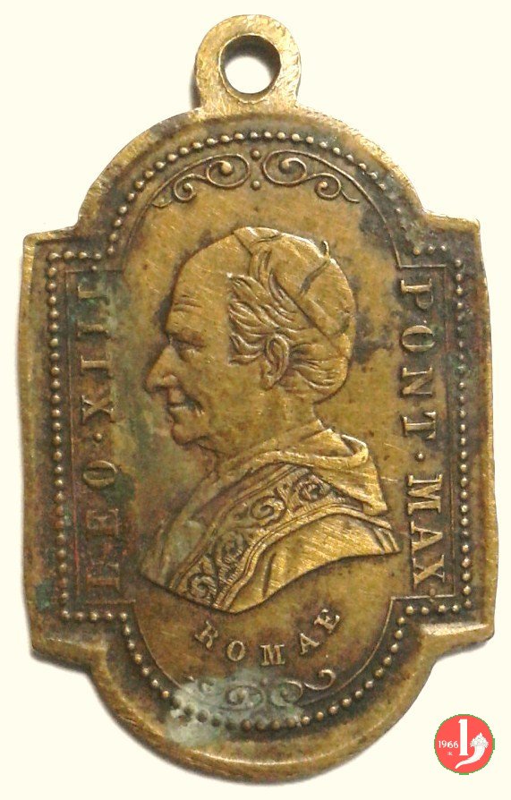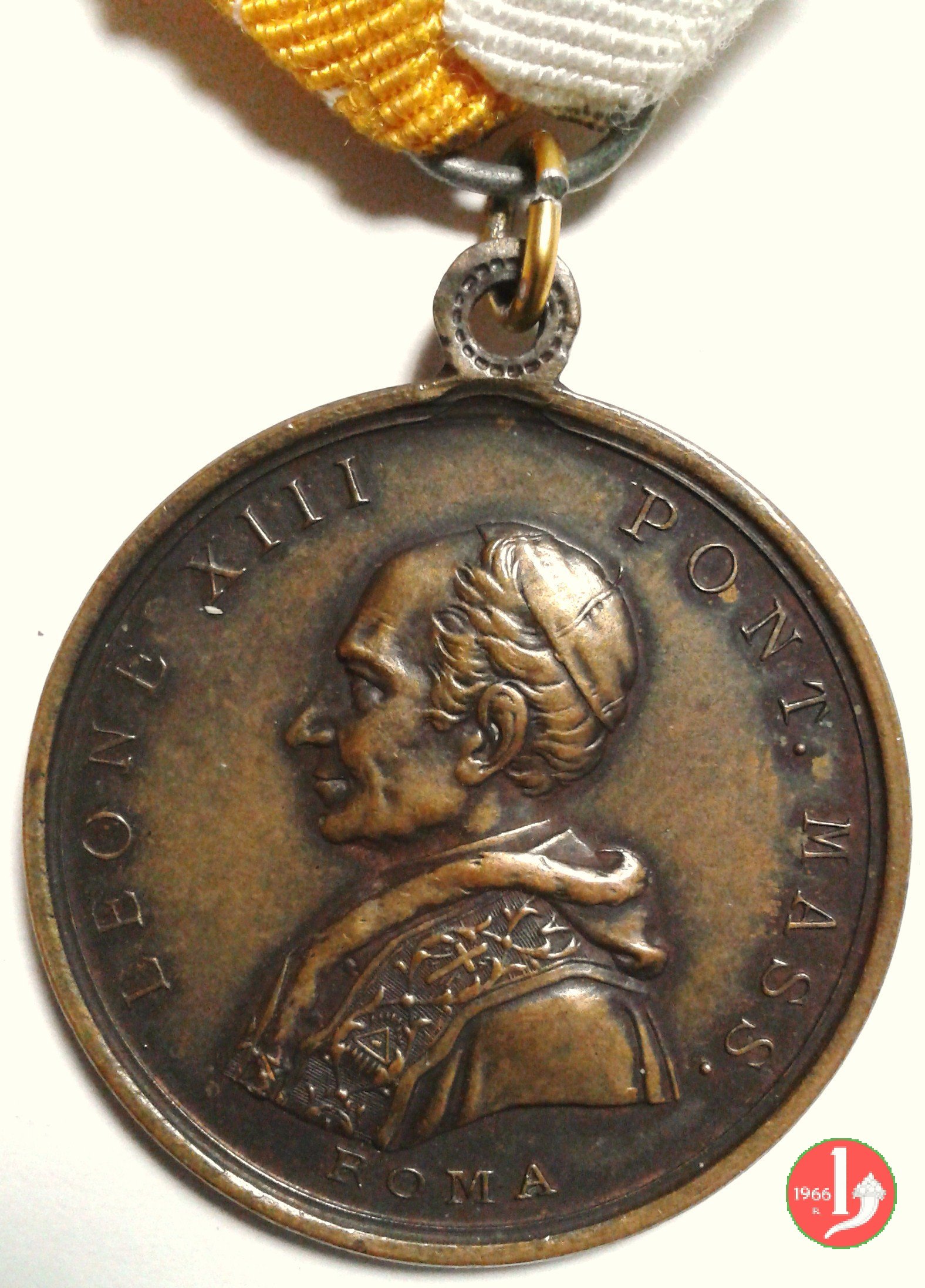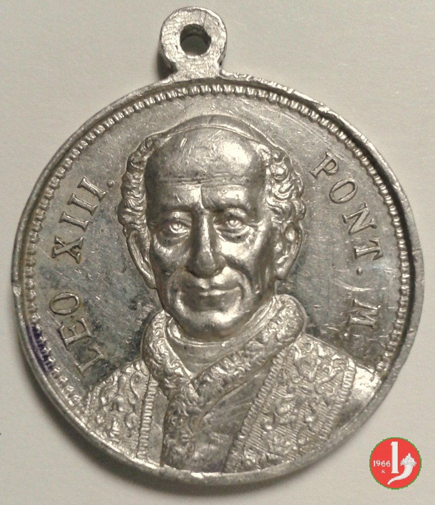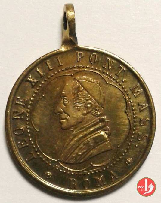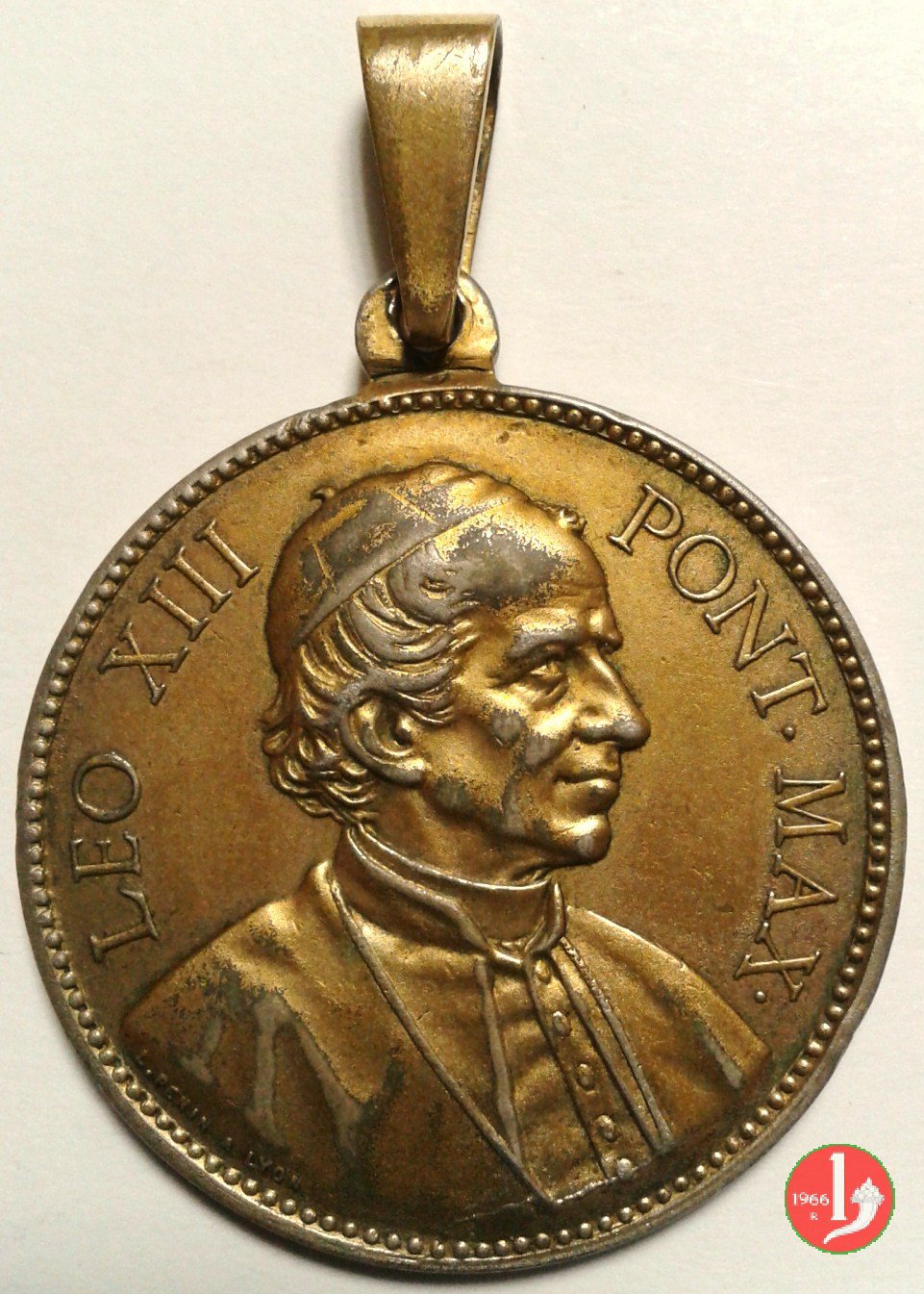L'immacolata 20mm (1878) DRITTO: bust left in beaded circle, LEONE XIII PONTIFICE MASSIMO; in exergue ROMA ROVESCIO: Nimbate Virgin Mary with radiant hands (Miraculous Medal) within beaded circle;