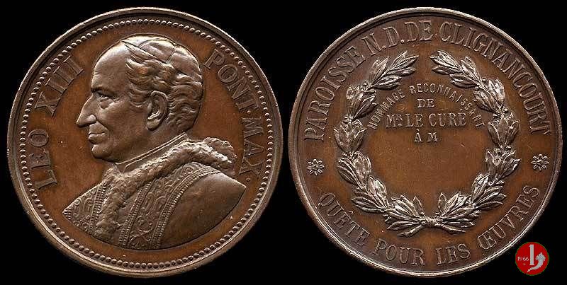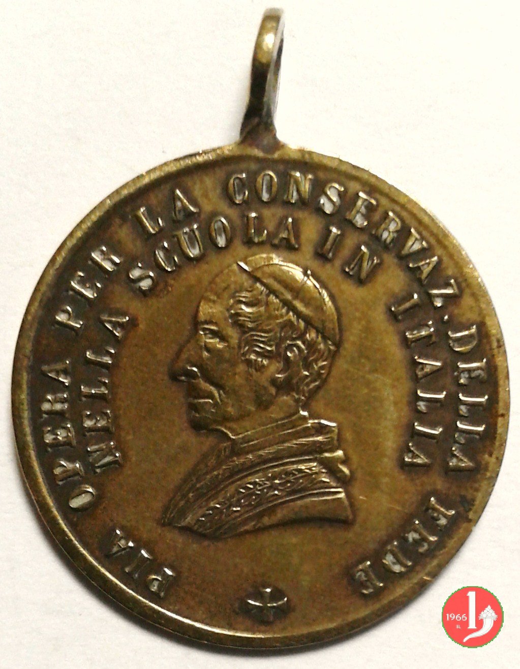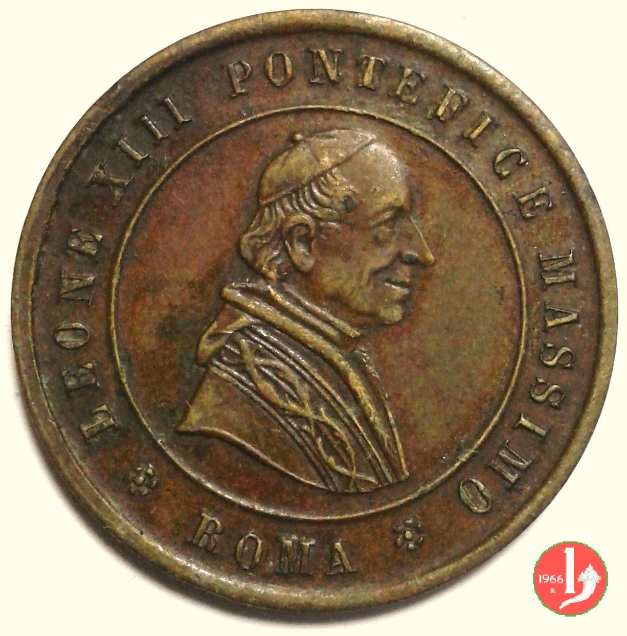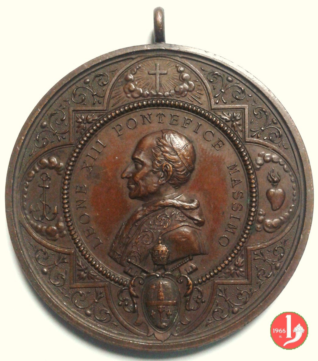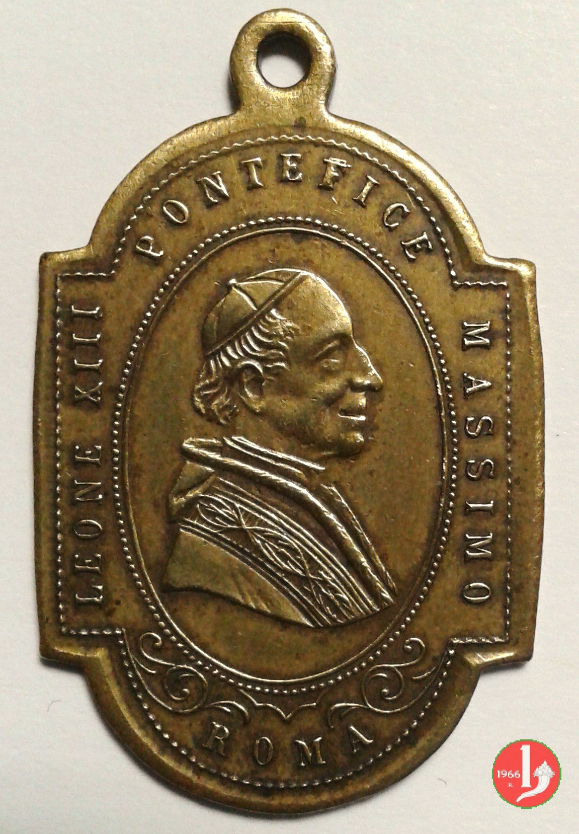 L'immacolata 20mm (1878) DRITTO: bust left in beaded circle, LEONE XIII PONTIFICE MASSIMO; in exergue ROMA ROVESCIO: Nimbate Virgin Mary with radiant hands (Miraculous Medal) within beaded circle;