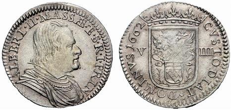 8 bolognini (capelli corti e stemma) (1662 - Massa di Lunigiana) HD Rauch 15 e 16 settembre 2008, lotto 2722 | Rauch H.D. | Sat 24/03/12 - 22:15 | ||