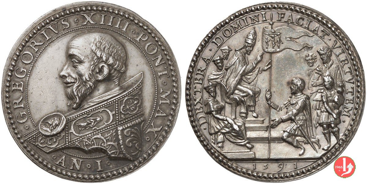 MEDAGLIA STRAORDINARIA - Gregorio XIII (1572-1585) - Anno I 1572 - Medaglia riconio, eseguita nel XIX secolo - Mazio, emessa per ricordare le provvidenze elargite dal Pontefice per realizzare opere artistiche e urbanistiche alla città di Roma. La Provvidenza -Mo750 -- al D/ all'interno di un doppio festone, busto del Pontefice verso sinistra, con piviale ricamato, nel quale predica l'Apostolo - sotto il busto iniziali dell'incisore: • LAV • P • - attorno la dicitura: GREGORIVS • XIII • PONTIFEX • MAX • A • I - - - -- al R/ all'interno di un cerchio perlinato, figura stante della Provvidenza Cristiana con lunga asta sulla sinistra, spada con la destra, in basso sulla sinistra timone e globo - attorno la dicitura: PROVIDENTIA CHRIST - - bronzo argentato - peso gr. 26,85 - diametro mm. 37,05 - spessore mm. 2,95 - contorno liscio - incisore Lorenzo Fragni (Orafo e medaglista, incisore di gemme e di stampi. Attivo nella seconda metà del XVI secolo. Fu chiamato a Roma dallo zio Gian Federico Bonzagna nel 1568 e nel 1672 fu nominato da Pio V "stampatore" alla Zecca. Probabilmente cessò dal suo ufficio nel 1586 poiché dopo questa data il suo nome non piú ricordato nei registri dei conti della Camera Apostolica, era ancora vivo nel 1618) - grado di rarità: R² - conservazione SPL/FDC -- Rif. Cat. Modesti CNORP III 750 - Rif. Cat. RZ e Mazio 113 a pag. 31 n. IV - Rif. Cat. Martini 1968 - Rif. Cat. Barbero n. 121 pag. 18/2016 - Rif. Cat. La Moneta codice W-B27/110-2 - (R)