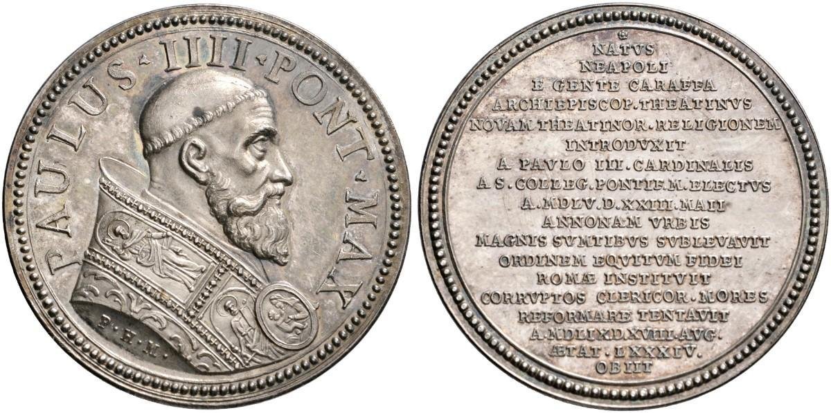 MEDAGLIA STRAORDINARIA - Paolo II (1464-1471) - Medaglia riconio del XIX secolo Mazio, emessa per ricordare la lotta contro gli eretici - - al D/ effigie del Pontefice a capo nudo verso destra, con piviale istoriato con i busti dei SS. Apostoli Pietro e Paolo, grosso razionale a chiusura del piviale raffigurante lo stemma del Pontefice - attorno la dicitura: • PAVLVS • II • VENETVS • PONT • MAX (minima frattura di conio sul bordo che partento da ore 1 lambendo la lettera V di VENETVS arriva quasi alla guancia sinistra del Pontefice) - al R/ all'interno di un cerchio, battuta di caccia al cinghiale - in basso su tre righe la dicitura: • SOLVM • IN • FERAS • / • PIVS • BELLATVR • / • PASTOR • -- bronzo argentato - AE Argentato -- peso gr. 57,75 - diametro mm. 44,00 - spessore mm. 4,00 - incisore Girolamo Paladino (medaglista attivo nella seconda metà del XVII secolo a Roma. Conosciuto specialmente per l'esecuzione di medaglie papali "di restituzione" cioè recanti l'effigie di Pontefici che erano vissuti in periodi precedenti all'epooca in cui egli lavorò) - condizione SPL/FDC - Rif. Cat. Modesti CNORP 128 - Rif. Cat. RZ e Mazio 19 a pag. 6 n. III - Rif. Cat. La Moneta codice W-B6/32-2 - (R)