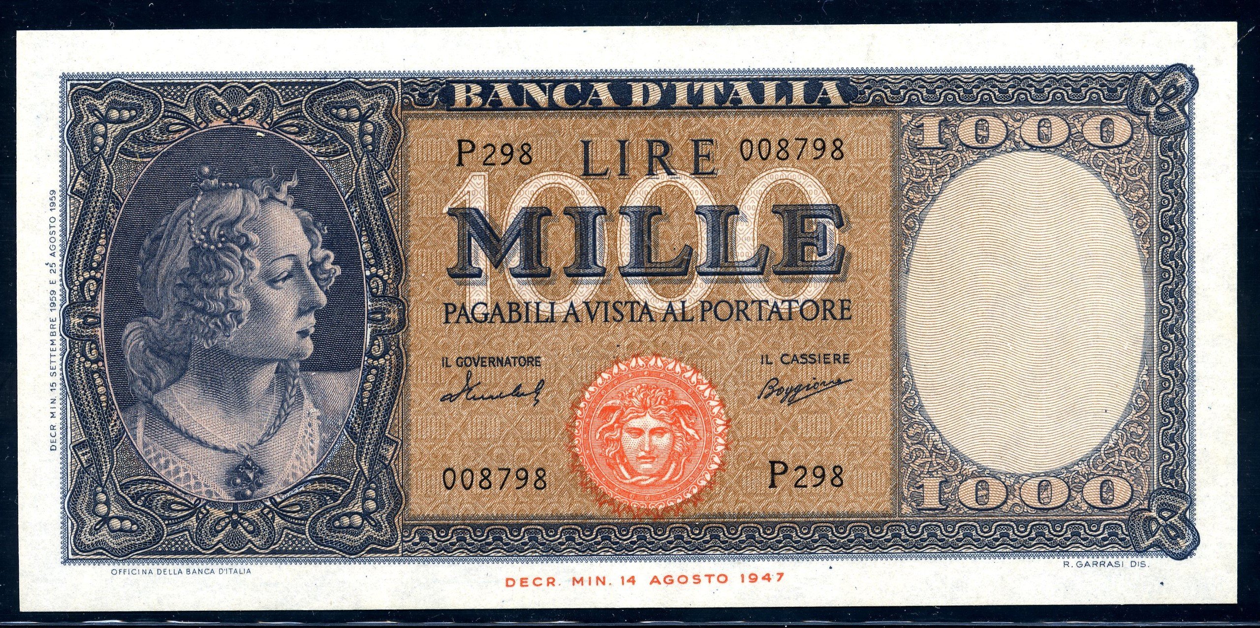 1.000 lire Busto d'Italia (1959) Verso | Tue 26/11/24 - 15:47 | |||