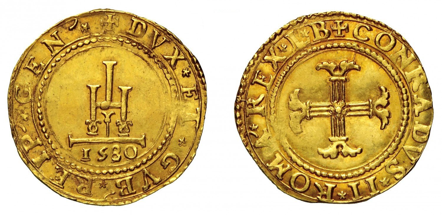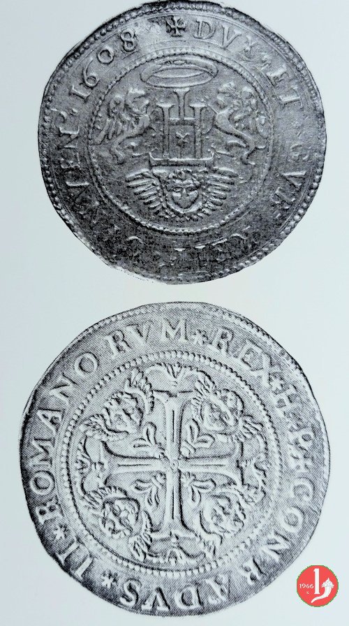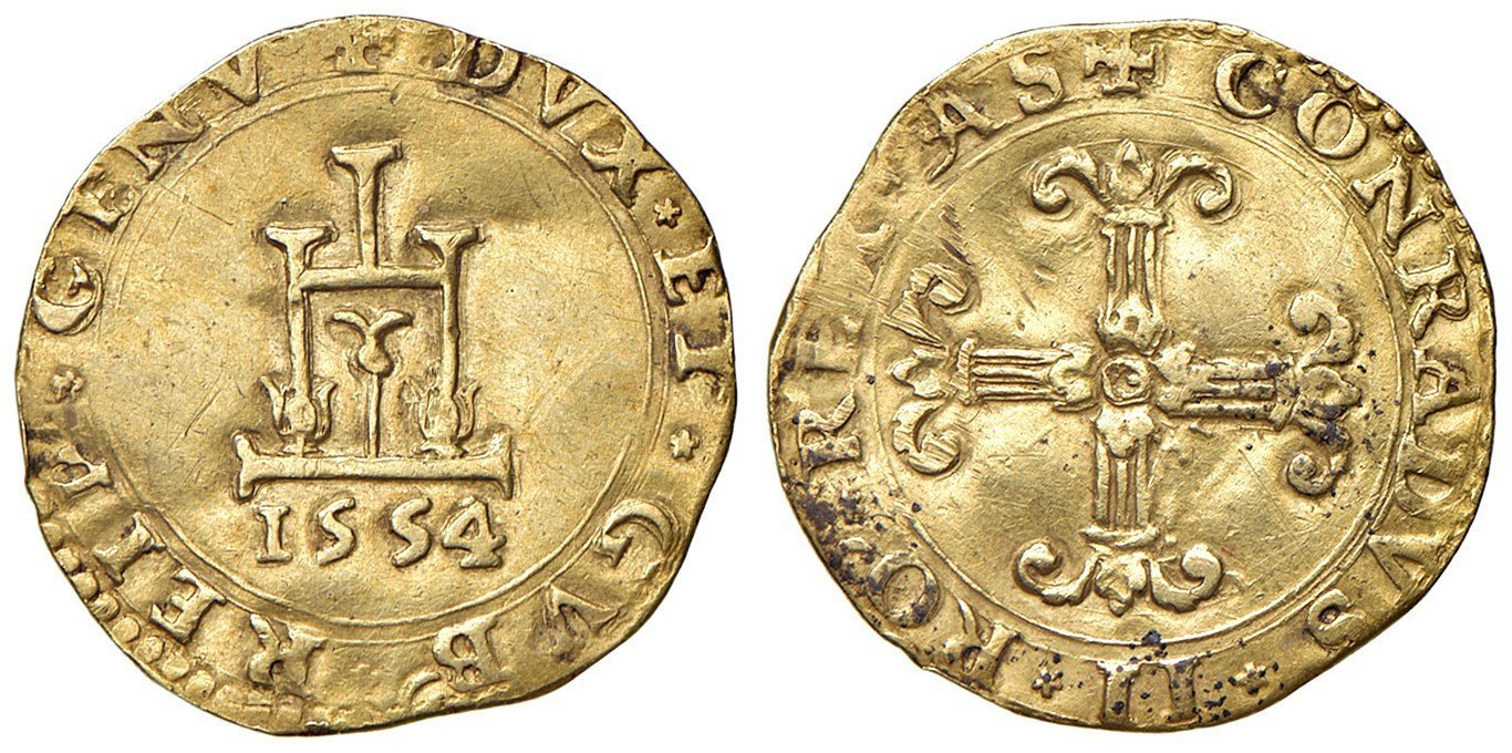 Quindici doppie (1608 - Genova) Esemplare unico presente nella Collezione Reale ma non descritto sul CNI, pare sia stato trafugato insieme ad altre monete genovesi. Foto da Le monete genovesi di Pesce e Felloni. (B) Entrambe le facce | Circolo Numismatico "Corrado Astengo" | Mon 12/02/24 - 11:33 | ||