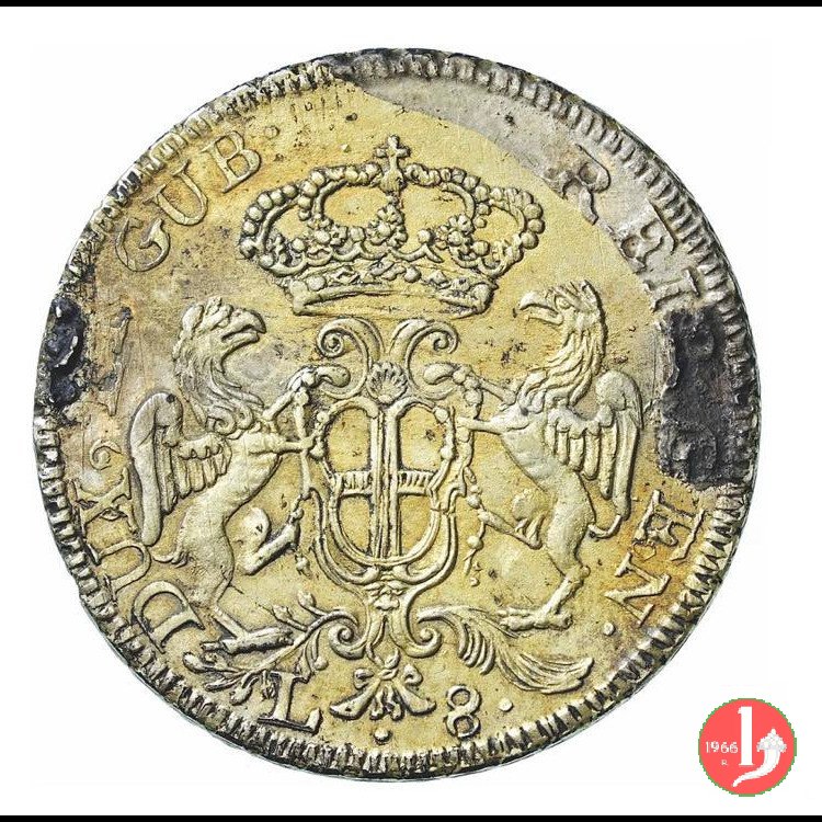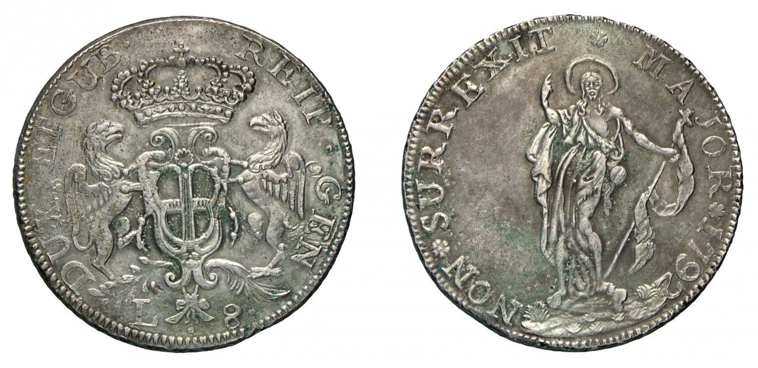 8 lire nuove (1792 - Genova) Scudo da 8 Lire Ag., Repubblica di Genova, 1792, Vecchio Stemma, periziata NIP in conservazione BB+ Verso | Sat 23/12/23 - 21:14 | |||