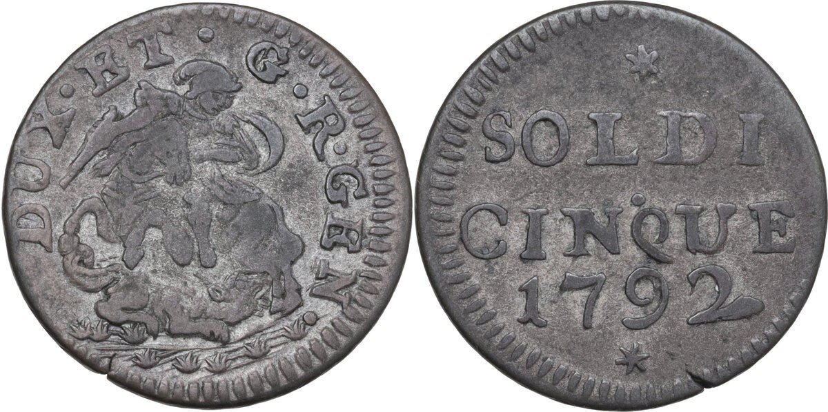 5 soldi (1792 - Genova) Asta Artemide 66E , lotto 834 (B) Entrambe le facce | Artemide Aste | Sat 9/03/24 - 16:57 | ||
