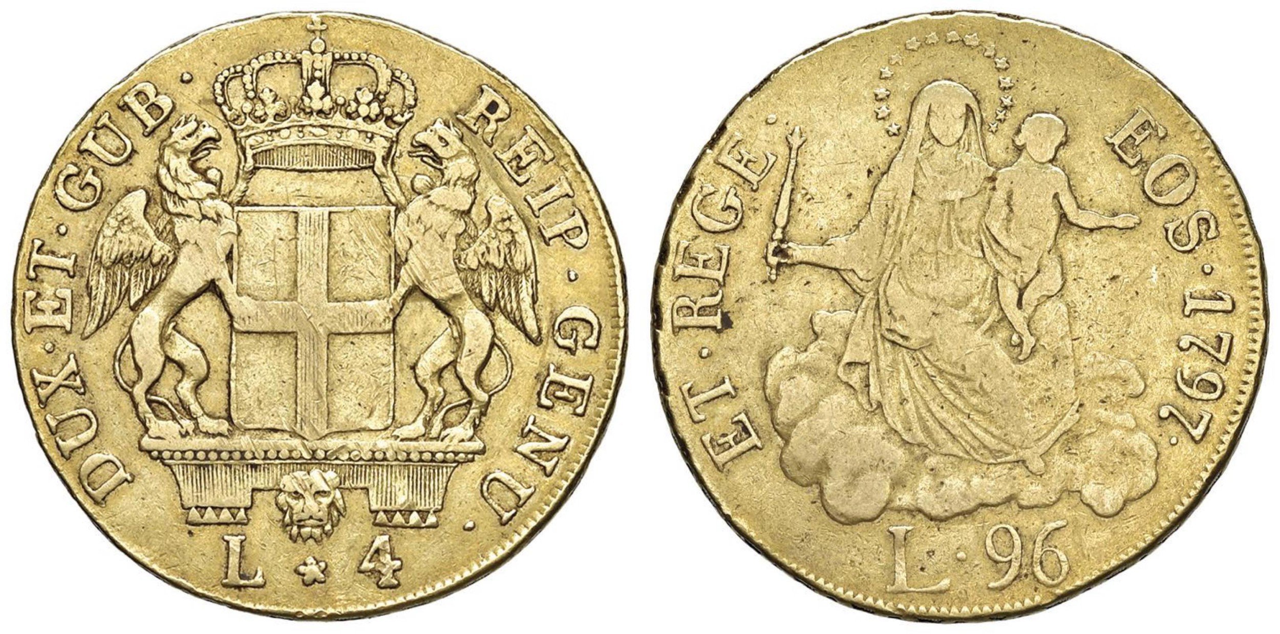 96 lire nuove (1797 - Genova) Asta Nomisma 69, lotto 1136 - altro esemplare con il retro dello scudo da 4 lire di S. Giovanni qui segnalato come errore di conio dovuto allo scambio dei coni del retro. Entrambe le facce | Nomisma | Sat 23/03/24 - 11:36 | ||