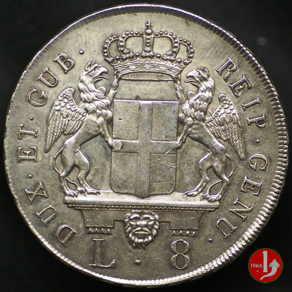8 lire nuove (1792 - Genova) 8 Lire 1792 stemma vecchio: CNI 7/10 MIR 308/1 Ag g 33,10 | Numismatica Varesi | Tue 7/10/08 - 23:21 | ||