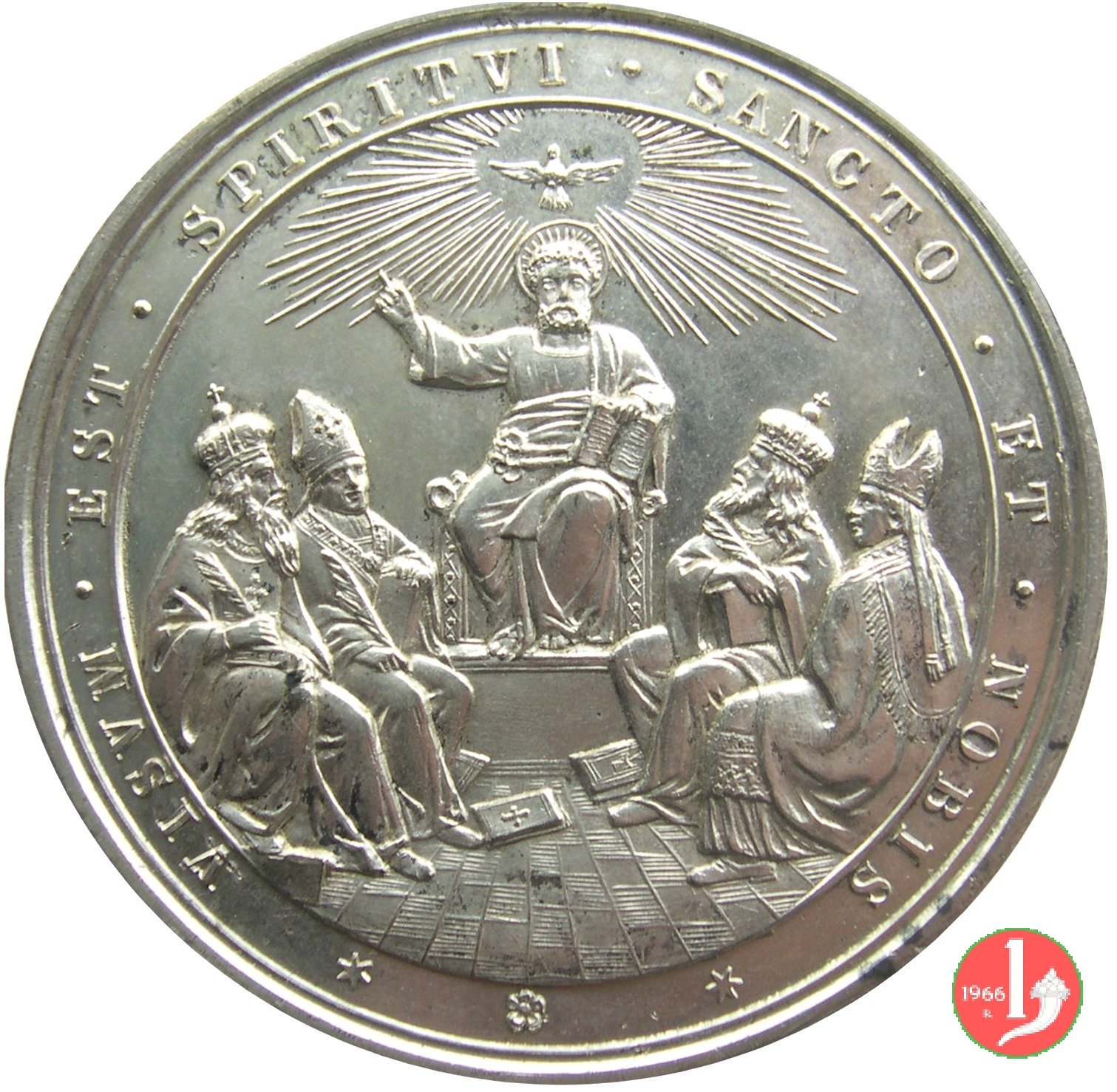 Concilio Ecum. -Pio IX e l'Immacolata -B17 (1869) D/ * CONCILIVM • VAT • AVSPICE • VIRGINE • IMM • A • PIO • IX • P • M • HABITVM • A • 1869 Il Papa a sx, genuglesso verso dx, prega L'Immacolata a dx, su nube, a braccia aperte coronata da stelle, in basso, a terra, il triregno e le chiavi R/* VISVM • EST • SPIRITVI • SANCTO • ET • NOBIS * in basso al centro rosetta Lo Spirito Santo radiante sopra San Pietro nimbato e seduto tra due Vescovi (con mitra) della Chiesa romana e due Patriarchi (con tiara) delle Chiese d'Oriente (B) | Tue 7/06/16 - 18:23 | |||