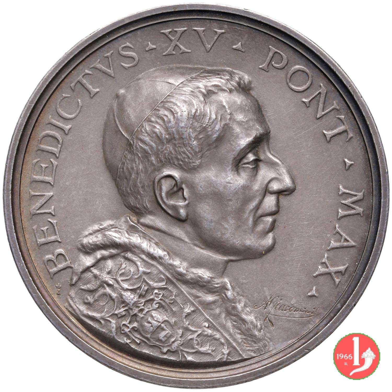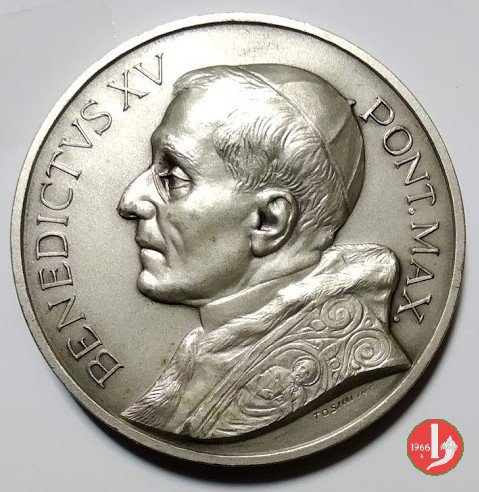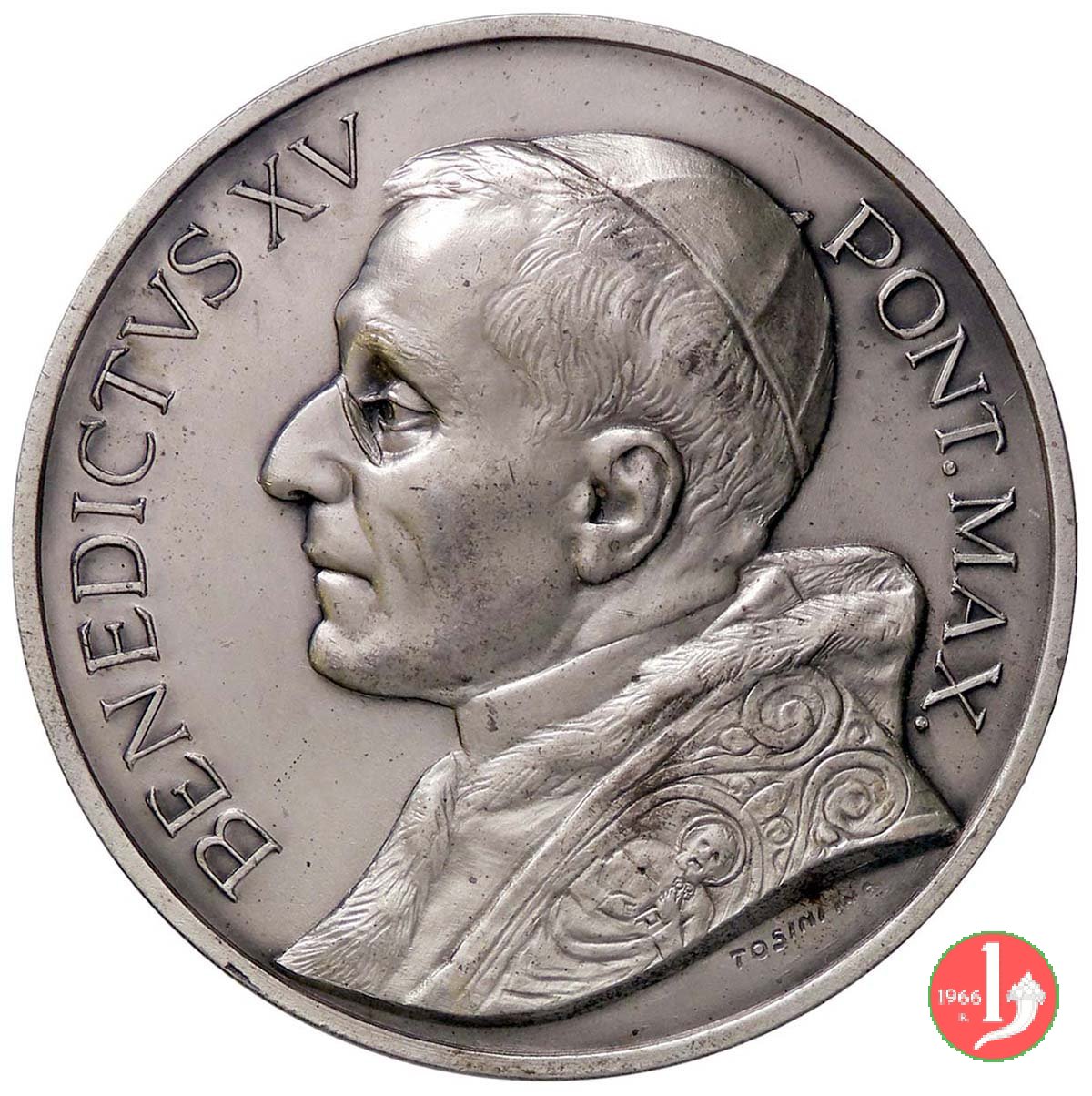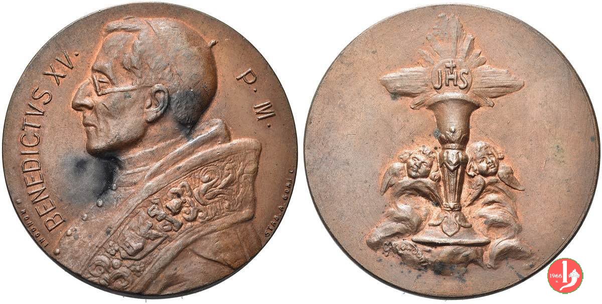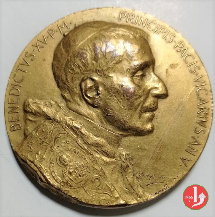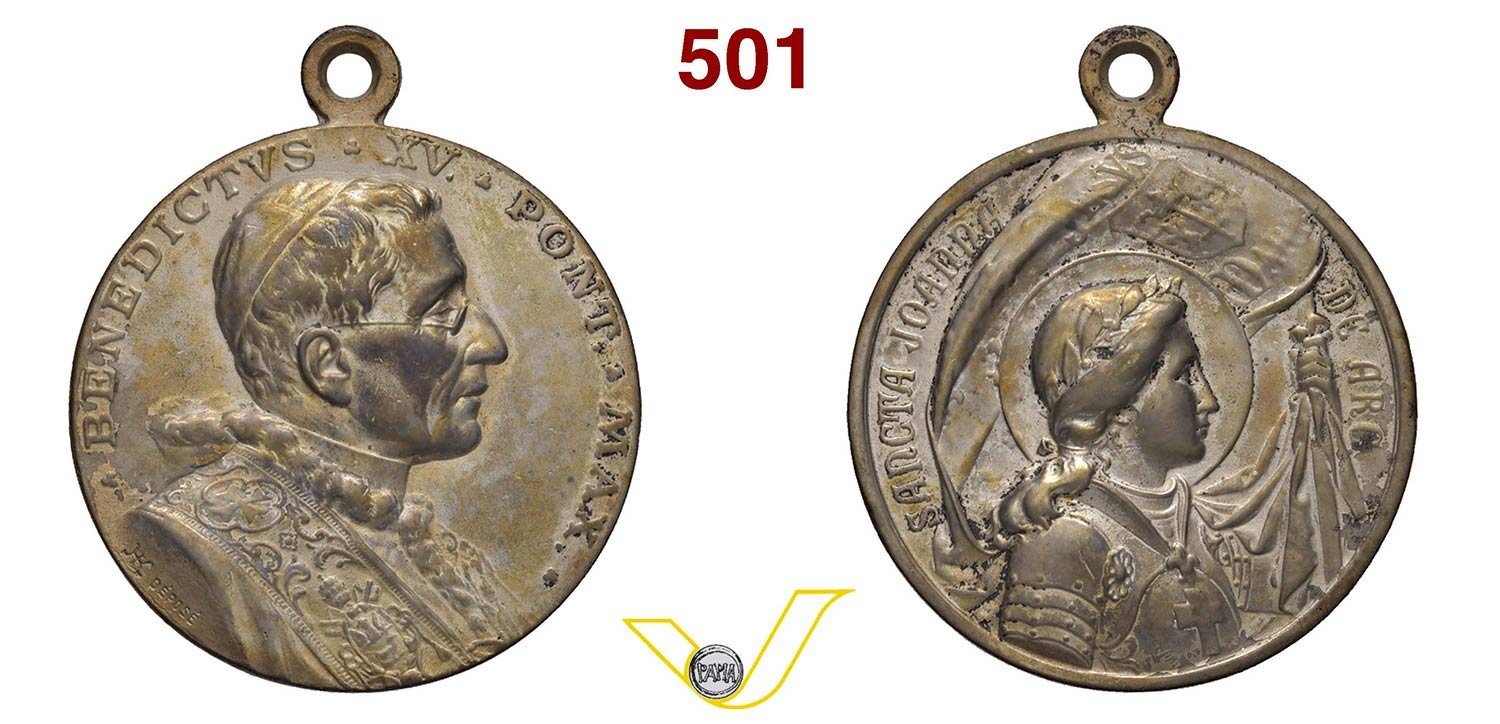 A. VI -Canonizzazione del 1920 -CM185 (1920) MEDAGLIA - Benedetto XV anno VI di Pontificato 1920 - commemorativa delle Canonizzazioni del 1920 - Medaglia ufficiale annuale, coniata con fondo lucido, emessa il 29-06-1920 a ricordo della Canonizzazione di Giovanna D'Arco, Margherita M. Lacoque e Gabriele Dell'Addolorata al Diritto: busto del Papa con zucchetto, mozzetta e stola verso sinistra - sul taglio della spalla: MISTRUZZI, attorno la legenda: BENEDICTVS • XV • PONT • MAX • ANNO • VI • - -- al Rovescio: I tre nuovi Santi sulle nubi radiati dalla colomba dello Spirito Santo - attorno la legenda: CAELITVM • SANCTORVM • HONORIBVS • AVCTI • - all'esergo la data: MCMXX Dritto | Thu 1/07/21 - 15:46 | |||