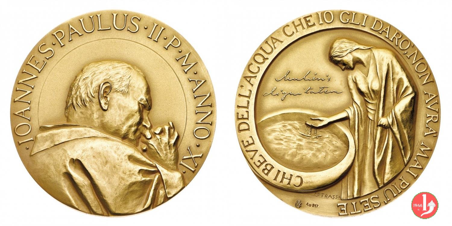 A. XI - Lettera Apostolica Mulieris dignitatem (1989 - Roma) MEDAGLIA - Papa Giovanni Paolo II - Anno XI - 1989 - CITTÀ DEL VATICANO - commemorativa Enciclica Mulieris Dignitatem - Medaglia ufficiale annuale, emessa il 29-06-1989 - - - - - - al D/ busto del Papa in preghiera verso destra - attorno: IOANNES • PAULUS • II • P • M • ANNO • XI • - - - -- al R/ La Samaritana attinge l'acqua con la mano - nel campo su due righe in corsivo: Mulieris / dignitatem - attorno la dicitura: CHI BEVE L'ACQUA CHE GLI DARO', NON AVRA' MAI PIU' SETE in basso il nome dell'autrice: PETRASSI e sull'esergo il marchio IPZS e titolo del metallo AG986 - sul contorno liscio in incuso: E CIVITATE VATICANA - e il numero della medaglia: 3192/6000 - - - - - argento - gr. 38,50 - titolo 986 - diametro 44 - pezzi coniati 6.000 - incisore Silvia Petrassi - n° 3192/6000 e dicitura E. CIVITATE VATICANA sul bordo - condizione FDC - Rif. Cat. Montenegro del 2010 n.11 a pag. 676 (B) Verso | Mon 2/09/13 - 14:35 | |||