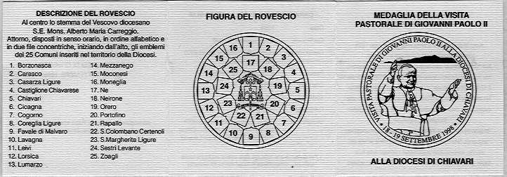 Visita a Chiavari 18-09-1998 (1998) fare correzione sulla descrizione del Diritto. Lo sfondo non sono nubi - ma è il promontorio di Portofino visto da Chiavari - infatti il Santo Padre pur essendo a Chiavari, sede della Diocesi, è venuto ufficialmente in Visita Pastorale alla Diocesi di Chiavari, come del resto testimoniato dai 25 emblemi dei Comuni inseriti nella stessa, conseguenza per cui monumenti chiavaresi (facciata del Duomo/Cattedrale e Santuario o il Castello, ecct.) sarebbero stati fuori luogo e poco diplomatici nei confronti degli altri grandi Comuni che si affacciano sul Golfo del Tigullio. (R) Verso | Sat 5/10/13 - 17:57 | |||