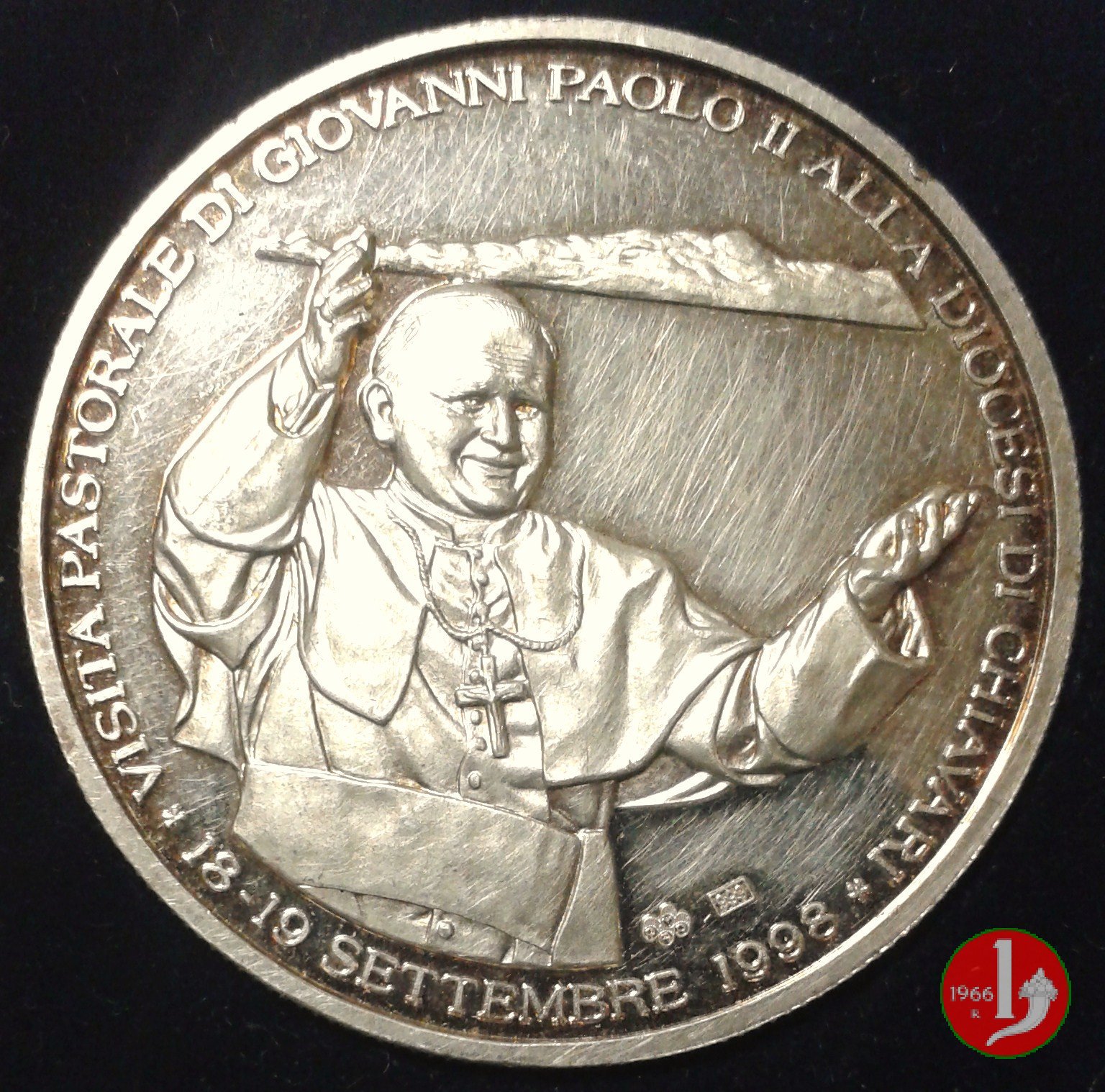 Visita a Chiavari 18-09-1998 (1998) Fondo Specchio - argento titolo 999 millesimi - contorno rigato - titolo: Visita Pastorale di Giovanni Paolo II alla Diocesi di Chiavari 18-19 Settembre 1998 al D/ Immagine festosa del Papa che saluta i fedeli. Sullo sfondo il promontorio di Portofino. al R/ al centro lo stemma del Vescovo diocesano S.E. Mons. Alberto Maria Careggio, attorno disposti in senso orario, in ordine alfabetico e in due file concentriche, iniziando dall'alto, gli emblemi dei 25 Comuni inseriti nel territorio della Diocesi Dritto | anonimo | Mon 11/03/13 - 17:53 | ||