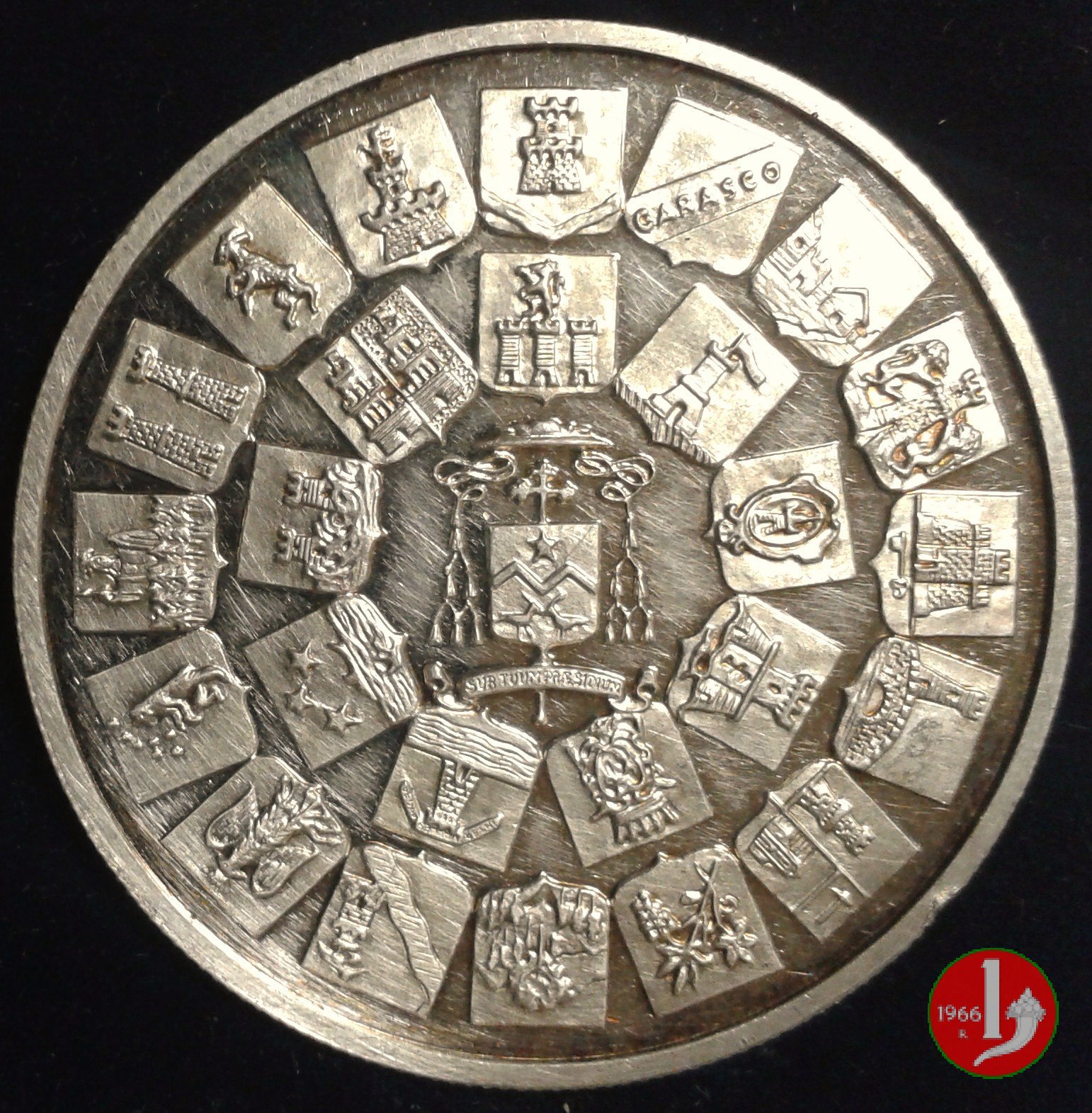 Visita a Chiavari 18-09-1998 (1998) Fondo Specchio - argento titolo 999 millesimi - contorno rigato - titolo: Visita Pastorale di Giovanni Paolo II alla Diocesi di Chiavari 18-19 Settembre 1998 al D/ Immagine festosa del Papa che saluta i fedeli. Sullo sfondo il promontorio di Portofino. al R/ al centro lo stemma del Vescovo diocesano S.E. Mons. Alberto Maria Careggio, attorno disposti in senso orario, in ordine alfabetico e in due file concentriche, iniziando dall'alto, gli emblemi dei 25 Comuni inseriti nel territorio della Diocesi Verso | anonimo | Mon 11/03/13 - 17:53 | ||