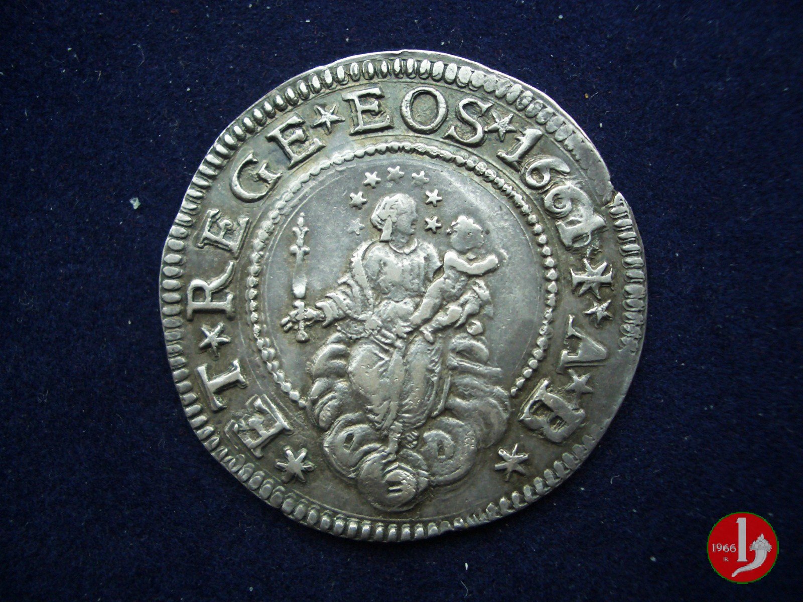 1 e 1/2 scudo largo (1664 - Genova) Raggi dietro alla testa del Bambin Gesú notati su un esemplare del 1650 e su quello del 1664 (B) | Mon 10/01/11 - 19:05 | |||