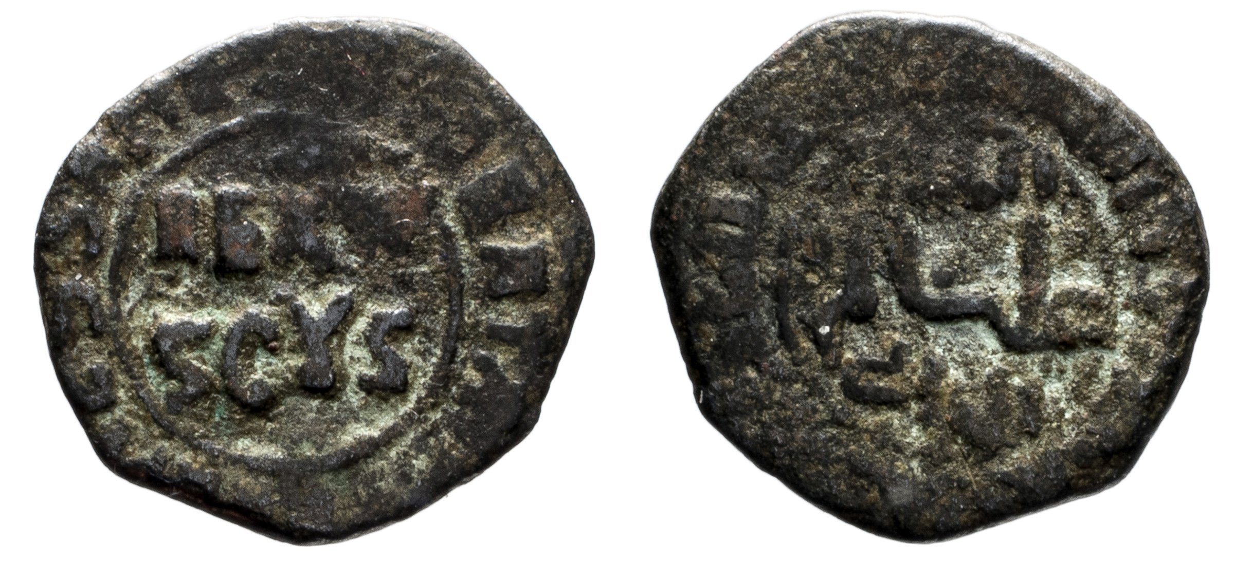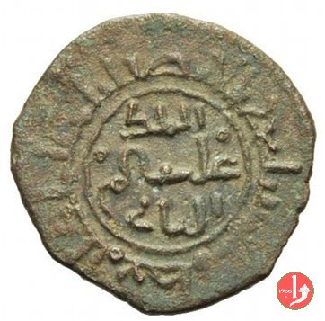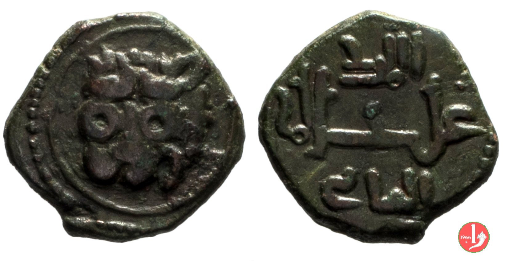 Tarí e Multiplo (Messina,Palermo) D/ In centro cinque globetti disposti a croce in un cerchio lineare intorno leggenda cufica circolare: Il re Guglielmo bramoso di essere esaltato da Dio.in cerchio lineare Leggenda cufica marginale indicante zecca e data (qui mancante). R/ Croce su lunga asta con le sigle IC XC NI KA entro cerchio lineare