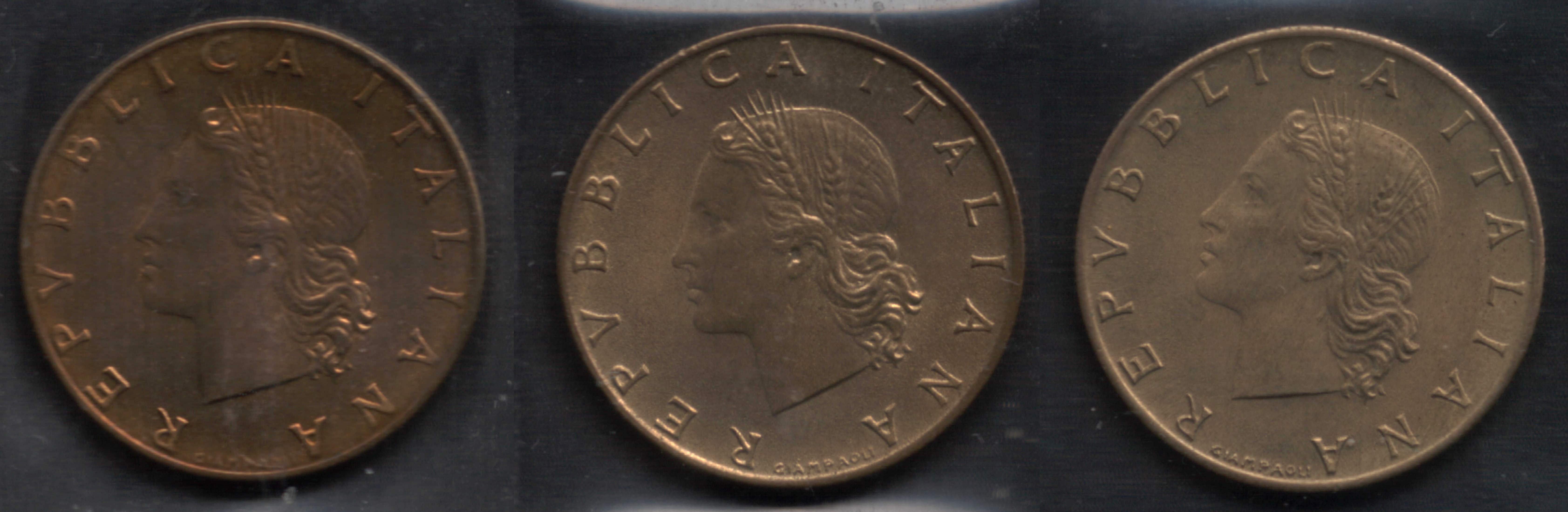 20 lire quercia (1959 - Roma) Alcuni esemplari, a causa della progressiva usura di conio, possono presentarsi con un conio piú o meno stanco. In particolare, negli esempi seguenti abbiamo, partendo da dx, un conio completamente stanco, uno intermedio ed uno perfettamente coniato. Si notino le spighe e i capelli raccolti sull'orecchio, la firma dell incisore, il volto (in particolare il labbro e l occhio dell allegoria dell Italia) e la A di "REPUBBLICA" nella leggenda | Tue 13/11/07 - 15:16 | ||