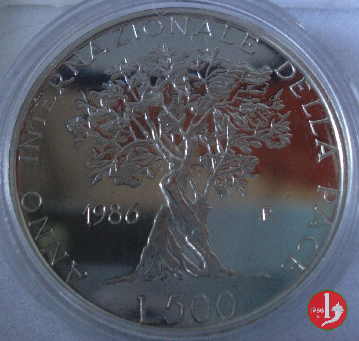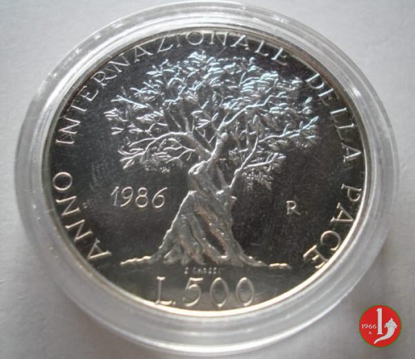 500 lire anno internazionale della Pace (1986 - Roma) Rovescio 500 lire PACE FS. Nota: sotto l'olivo, tra la base dell'albero e la scritta L 500 c'è il nome dell'autore "S. GROSSI" che nella foto non è venuta per le ben note difficoltà che comporta fotografare monete fondo specchio. | Sat 12/01/08 - 17:54 | ||