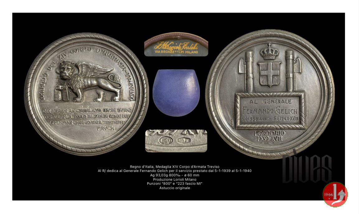 Comando del XIV Corpo d'Armata Treviso1939 -C- (1939) Contributore, Dives srl Dives Milano Medaglia in Argento 800‰ dal peso di 93,03g Coniata da Lorioli Milano Dedica al Generale Fernando Gelich per il suo servizio Di estrema rarità | anonimo | Fri 1/11/24 - 22:32 | ||