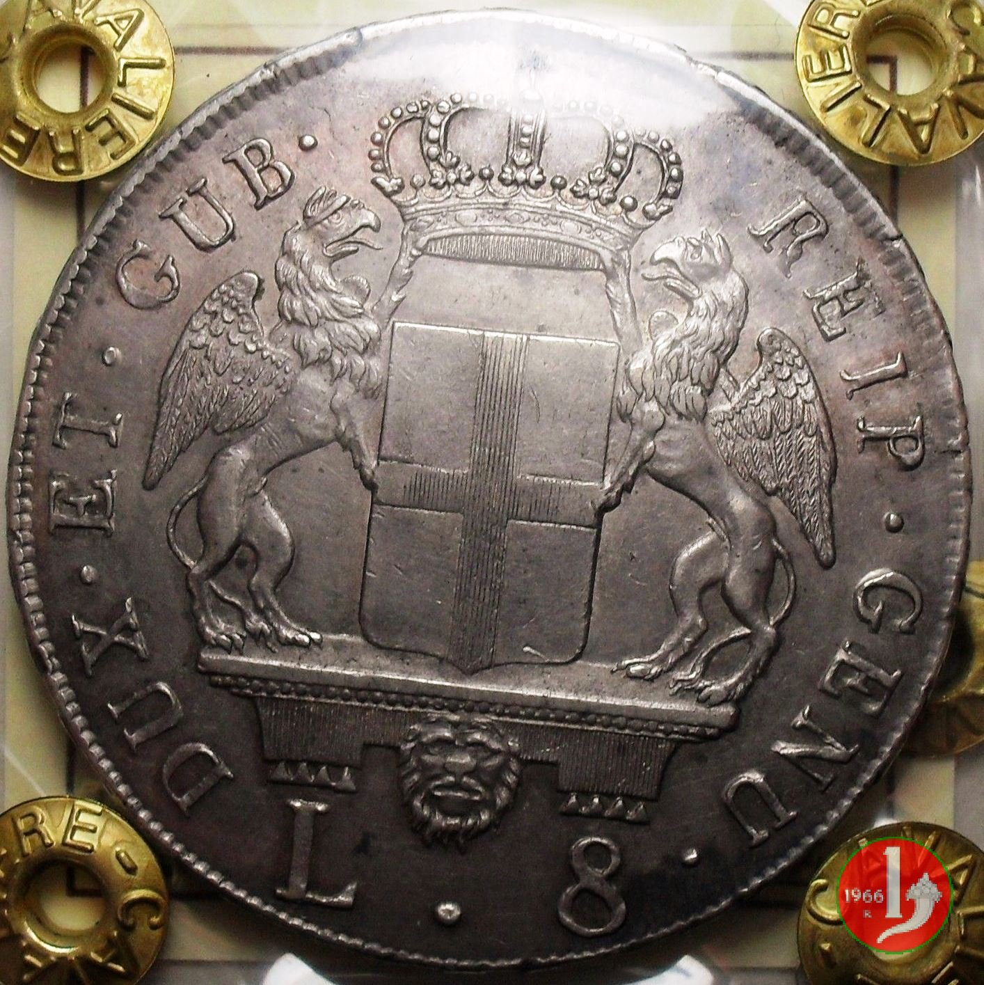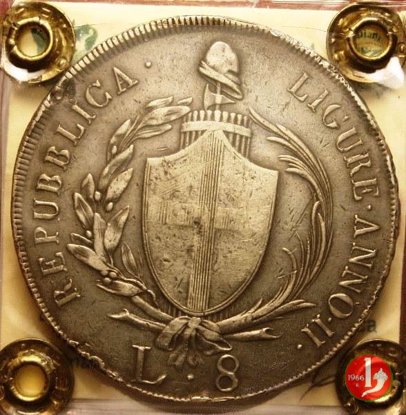8 lire (1799 - Genova) 8 Lire AG, Repubblica Ligure, Anno II, 1799, Sigillata NIP P.P. Testa Verso | Fri 12/02/16 - 20:05 | |||