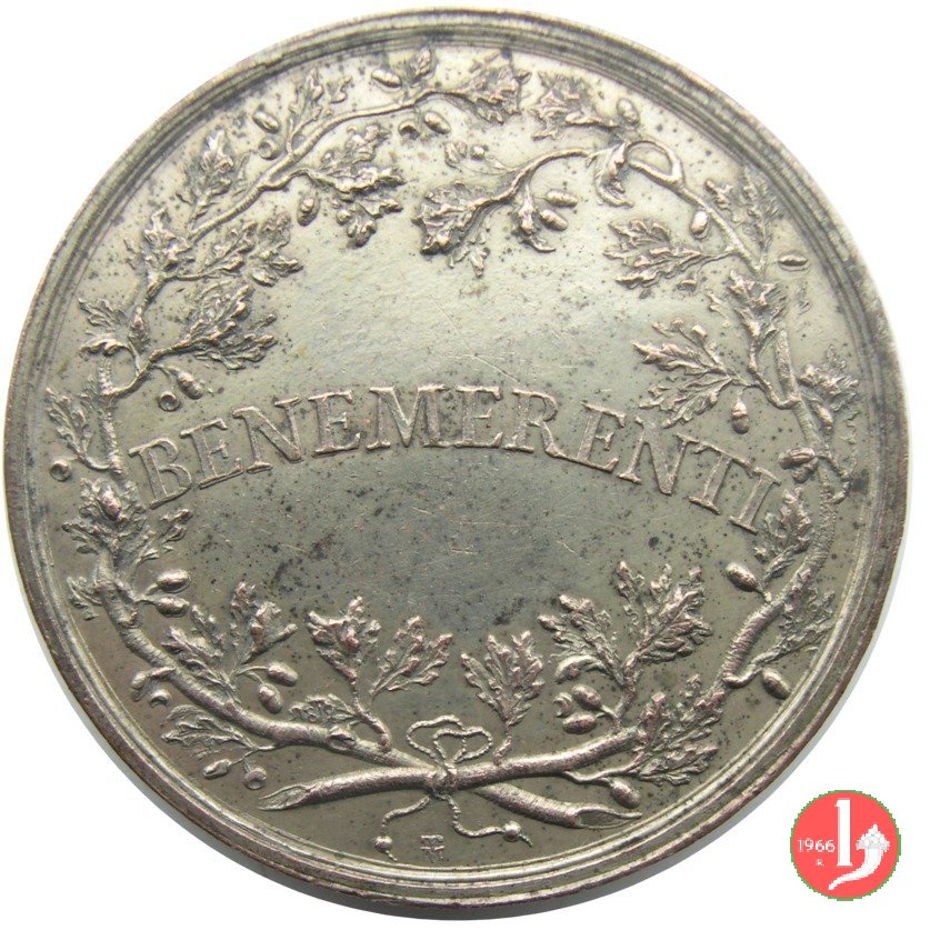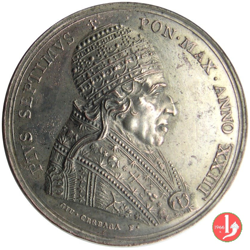 al D/ busto del Pontefice verso destra, con triregno e piviale ricamato con motivi tratti dallo stemma papale - sotto il busto il nome dell'incisore: GIU • CERBARA F • - attorno la dicitura: PIVS SEPTIMVS _ PON • MAX • ANNO XXIII al R/ tra due rami di quercia legati con nastro, in semicerchio: BENEMERENTI - in basso monogramma dell'incisore: TM - - bronzo argentato - AE argentato - peso gr. 38,25 - diametro mm. 42,40 - spessore mm. 3,65 - incisori: Giuseppe Cerbara per il D/ e Tommaso Mercandetti per il R/ - grado di rarità: RARA - condizione FDC - Rif. Cat. La Moneta codice W-AE1W/2-3 NOTA: questa medaglia si distribuiva in premio ai Benemeriti in qualunque ramo di Scienza, Arti e Lavori